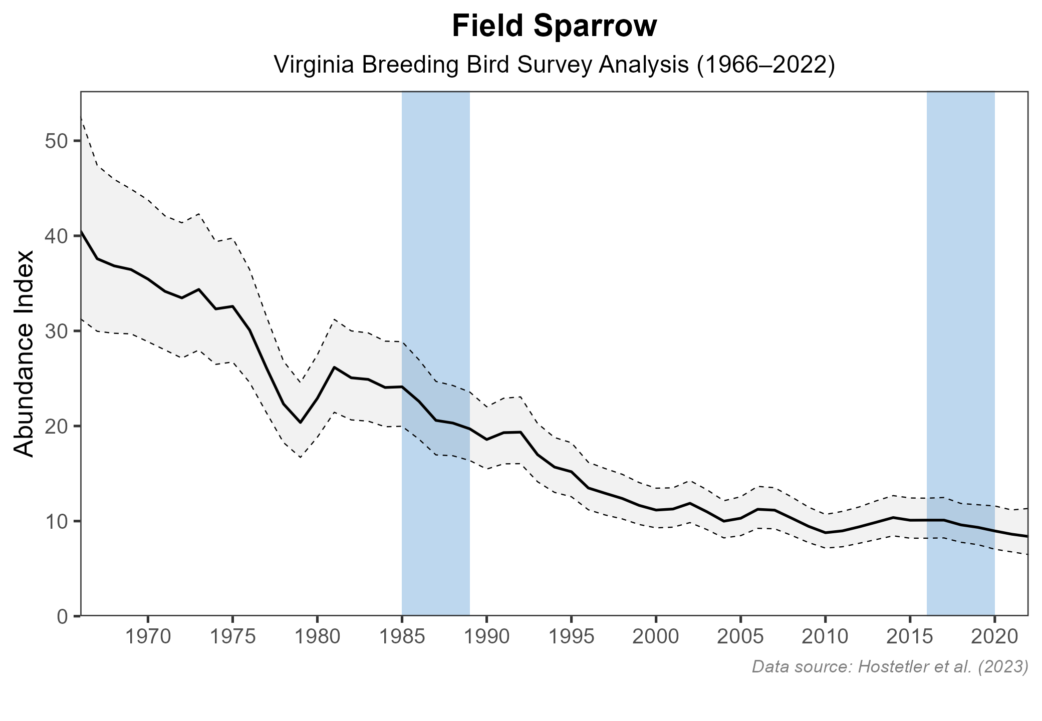 The total estimated Field Sparrow population in the state is approximately 442,000 individuals (with a range between 356,000 and 552,000). Despite their widespread and abundant nature, Field Sparrow populations are declining in Virginia. The North American Breeding Bird Survey (BBS) showed a significant decline of 2.77% per year from 1966–2022 (Hostetler et al. 2023; Figure 8). Between the First and Second Atlas, BBS data showed similar declines, with a decrease of 2.44% per year in Virginia from 1987–2018.
