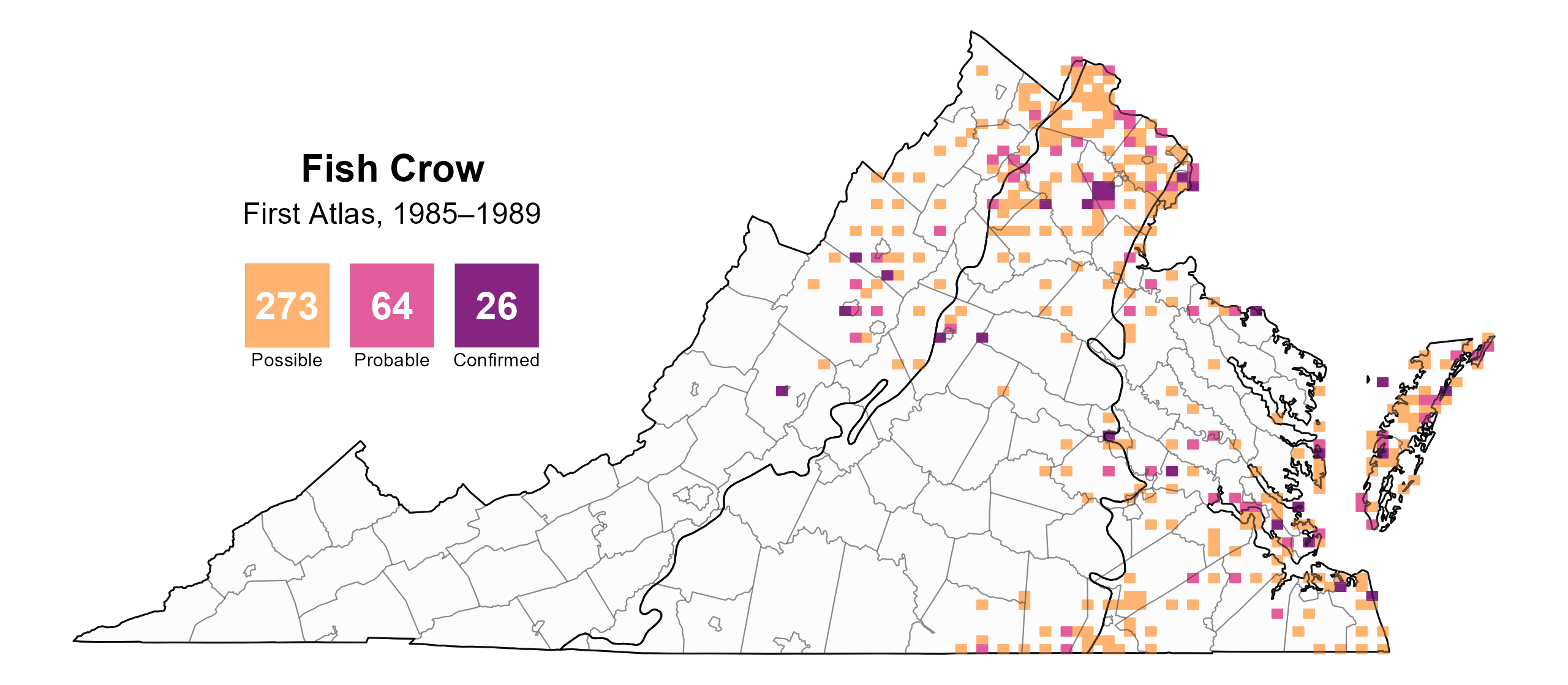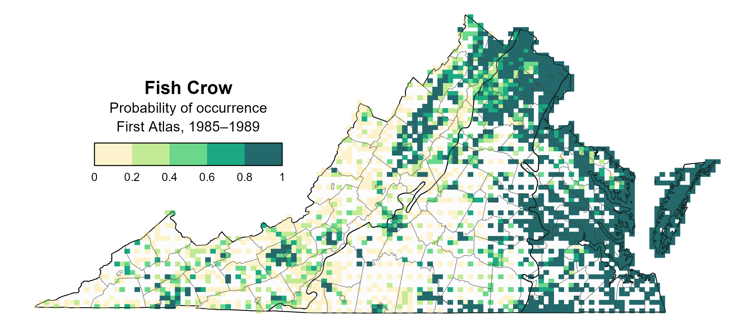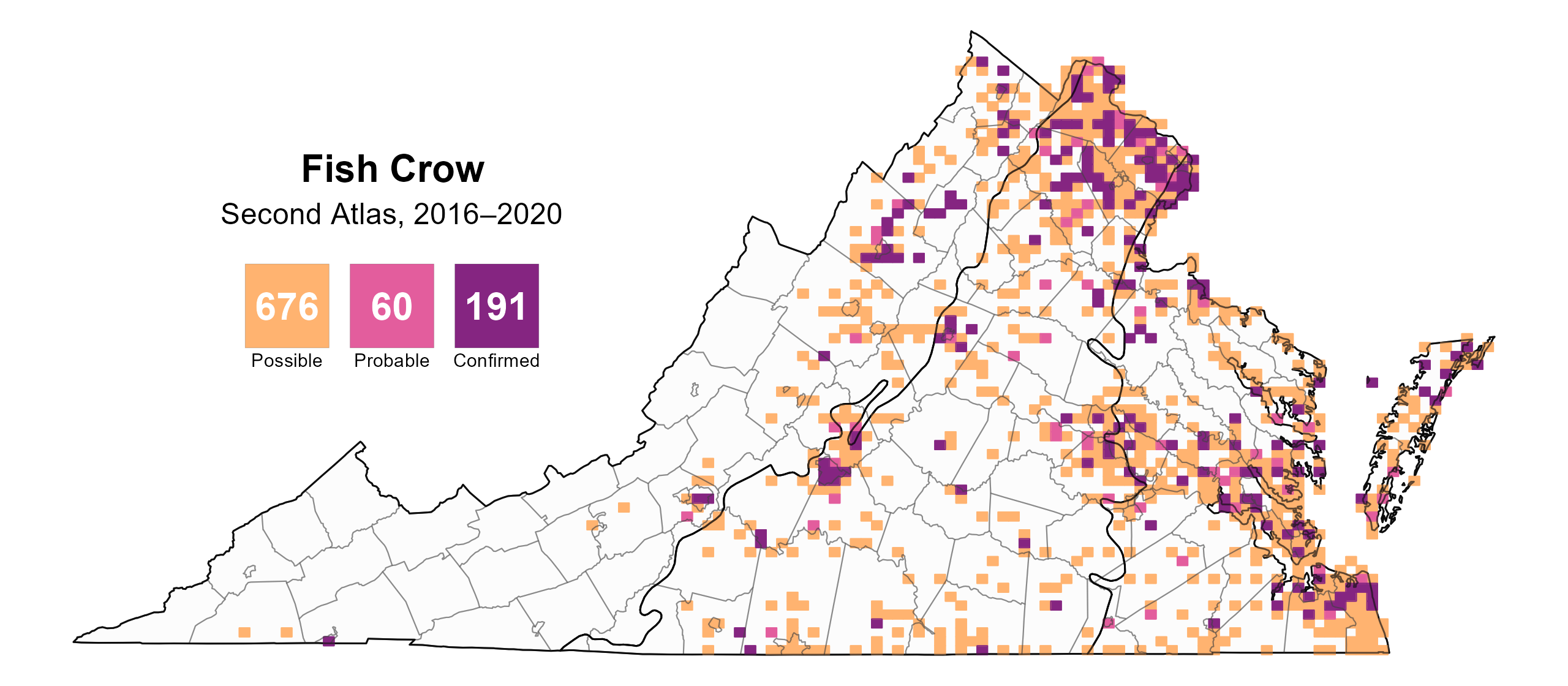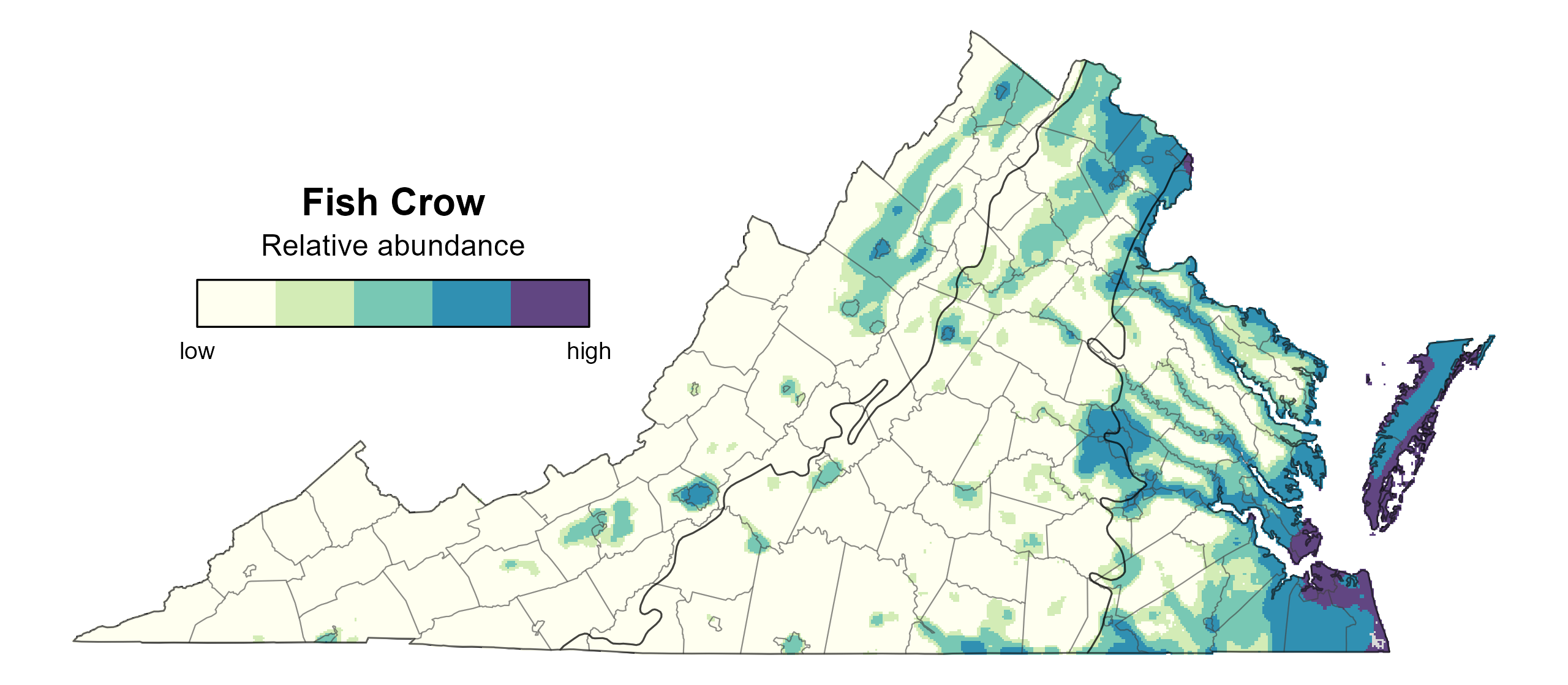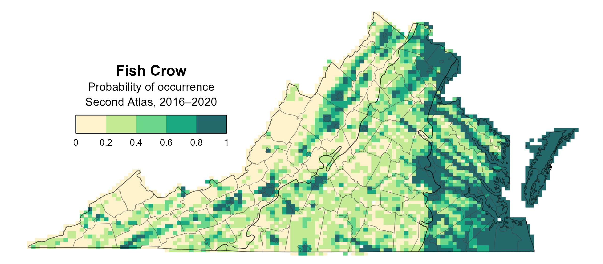 Fish Crows are present year-round in Virginia, though some birds may be short-distance migrants. They occur in all regions of the state but are concentrated in coastal and urban areas and along major rivers at lower elevations in the Mountains and Valleys region (Figure 1). The likelihood of Fish Crow occurrence decreases in a block as the proportions of shrubland and grassland habitats, forest cover, and agricultural cover increase.