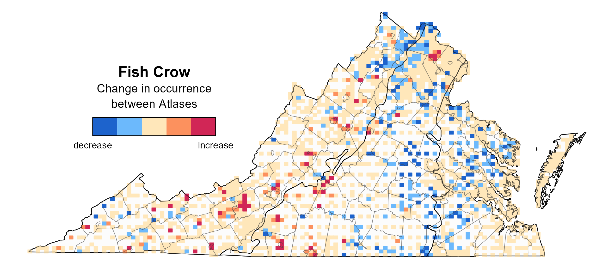 Between the First and Second Atlases (Figures 1 and 2), Fish Crow’s likelihood of occurrence decreased in the northwestern portion of the state, along some of the eastern area of the Piedmont, and the northern half of the Coastal Plain (Figure 3). However, its occurrence remained stable in its stronghold areas of the southeastern Coastal Plain and Eastern Shore. It should be noted that the environmental variables modeled may not have been sufficient for modeling the geographical limits of the species’ distribution (see Breeding Evidence).