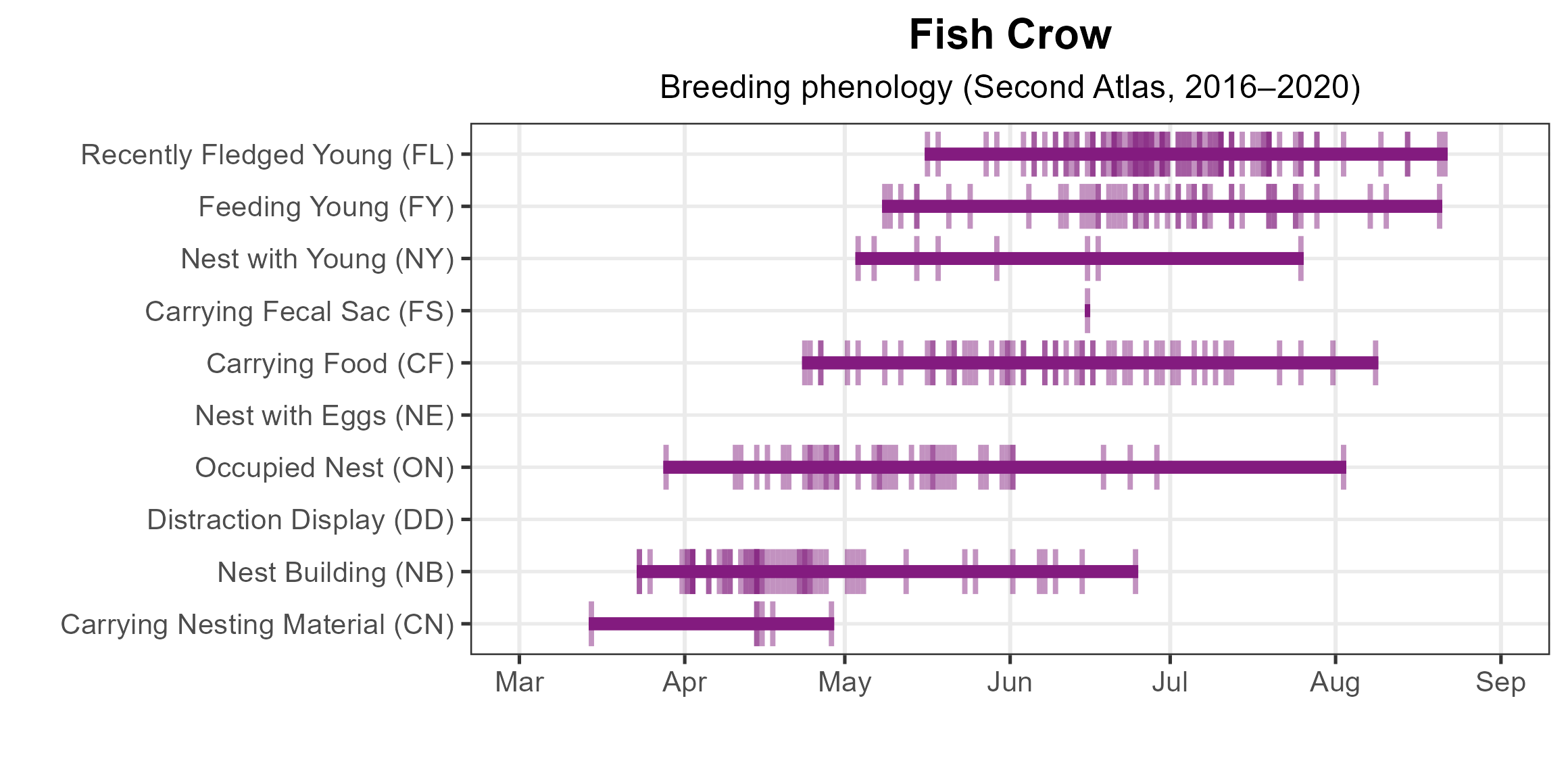 Figure 6: Fish Crow phenology: confirmed breeding codes. This graph shows a timeline of confirmed breeding behaviors. Tick marks represent individual observations of the behavior.