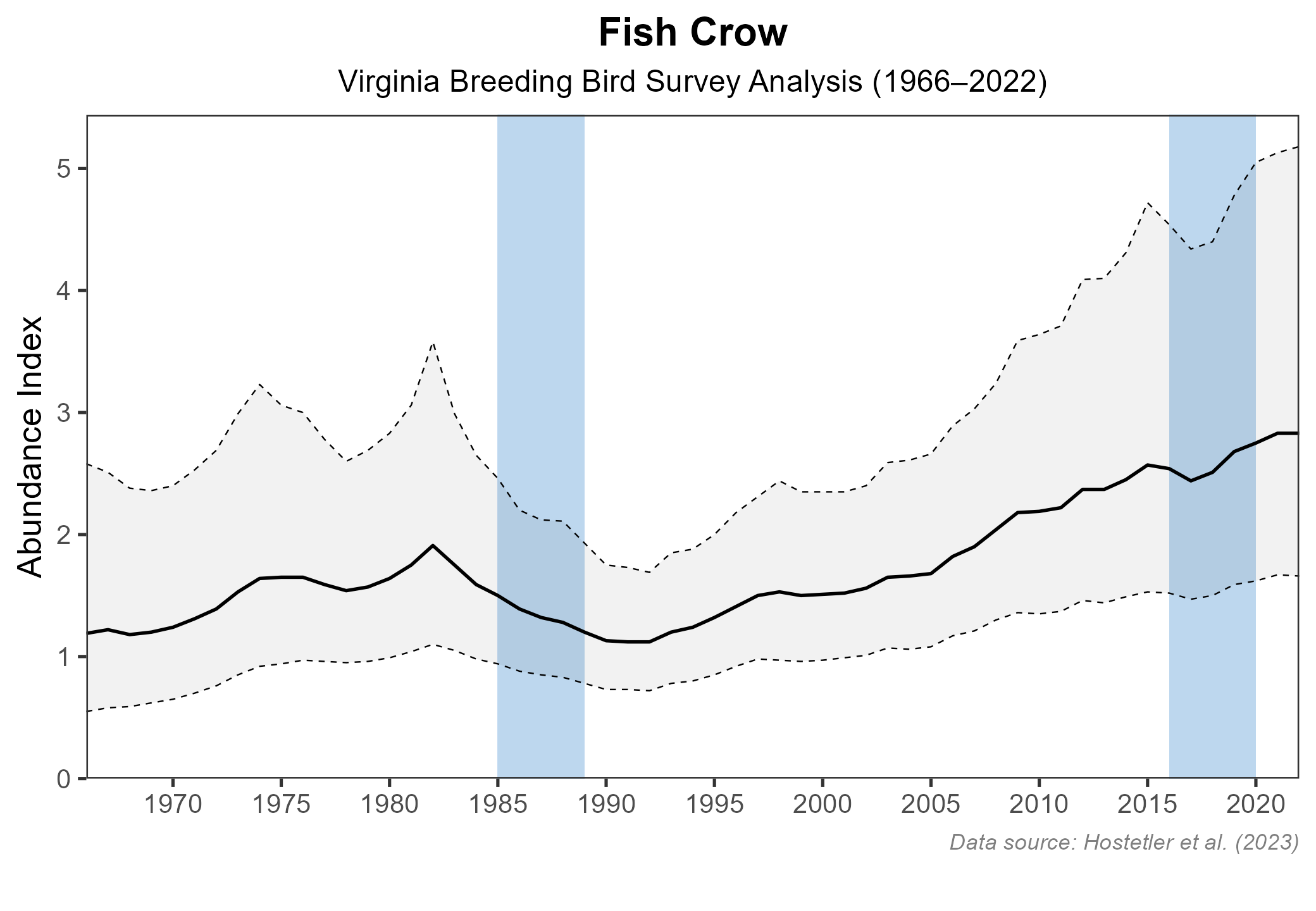 The total estimated Fish Crow population in the state is approximately 97,000 individuals (with a range between 44,000 and 224,000). Population trends for the species are stable to increasing in Virginia. Based on North American Breeding Bird Survey (BBS) data, the species experienced a nonsignificant increase of 1.56% per year from 1966–2022 (Hostetler et al. 2023; Figure 8). Between Atlas periods, the BBS trend for Virginia was positive, with a significant increase of 2.06% per year from 1987–2018. The causes of the range-wide increases in Fish Crow abundance are not well understood (McGowan 2020).