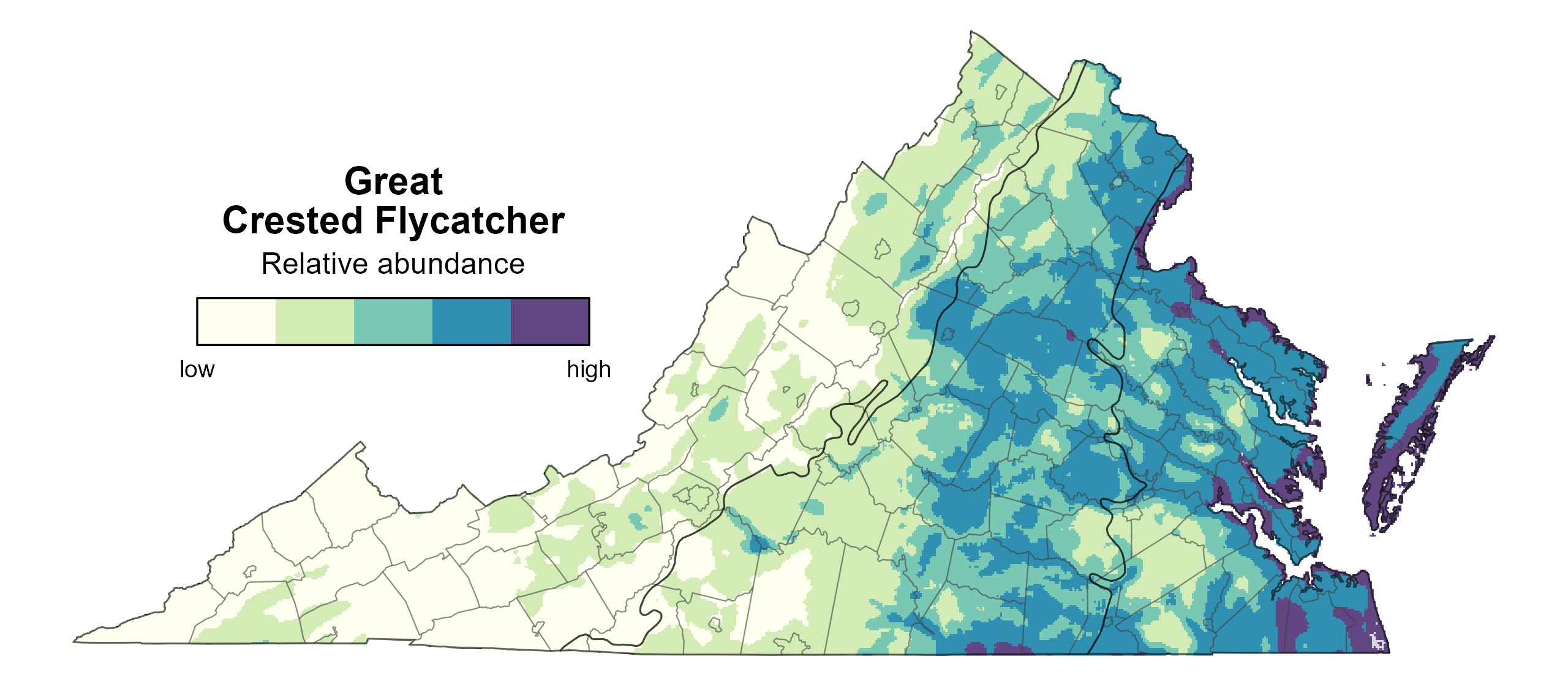 Great Crested Flycatcher relative abundance was estimated to be highest on the Eastern Shore and along the coastline of the Coastal Plain region. It was high to moderately high throughout remainder of the Coastal Plain and most of the Piedmont region (Figure 5). It was generally lower in the Mountains and Valleys region (Figure 5).