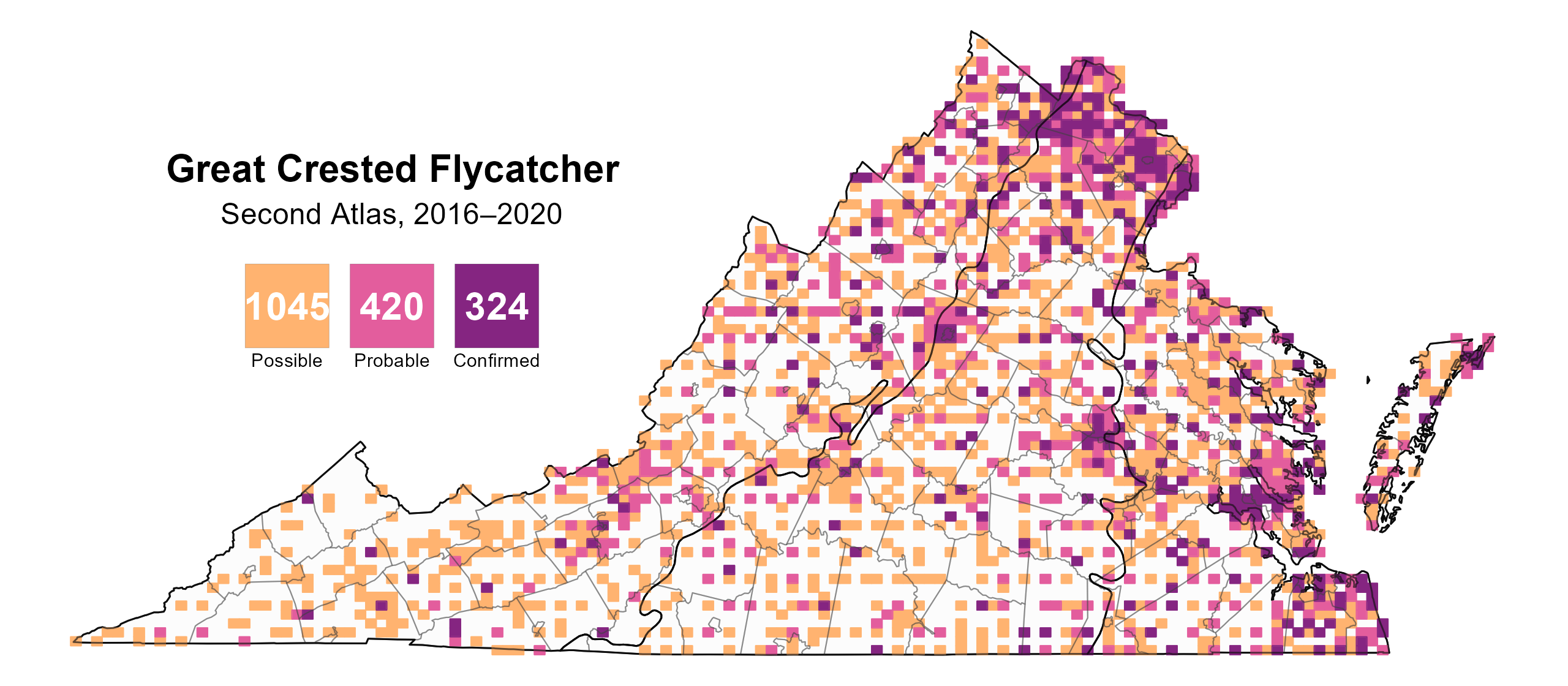 Figure 2: Great Crested Flycatcher breeding observations from the Second Atlas (2016–2020). The colored boxes illustrate Atlas blocks (approximately 10 mi2 [26 km2] survey units) where the species was detected. The colors show the highest breeding category recorded in a block. The numbers within the colors in the legend correspond to the number of blocks with that breeding evidence category.