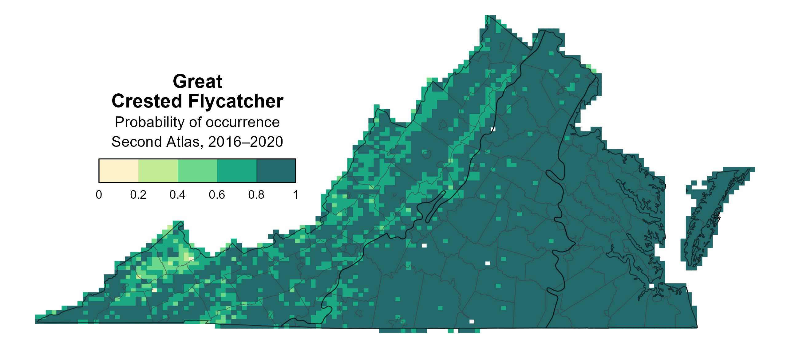 Figure 1: Great Crested Flycatcher breeding distribution based on probability of occurrence (Second Atlas, 2016–2020). This map indicates the probability that this species will occur in an Atlas block (an approximately 10 mi2 [26 km2] survey unit) based on environmental (including habitat) factors and after adjusting for the probability of detection (variation in survey effort among blocks).