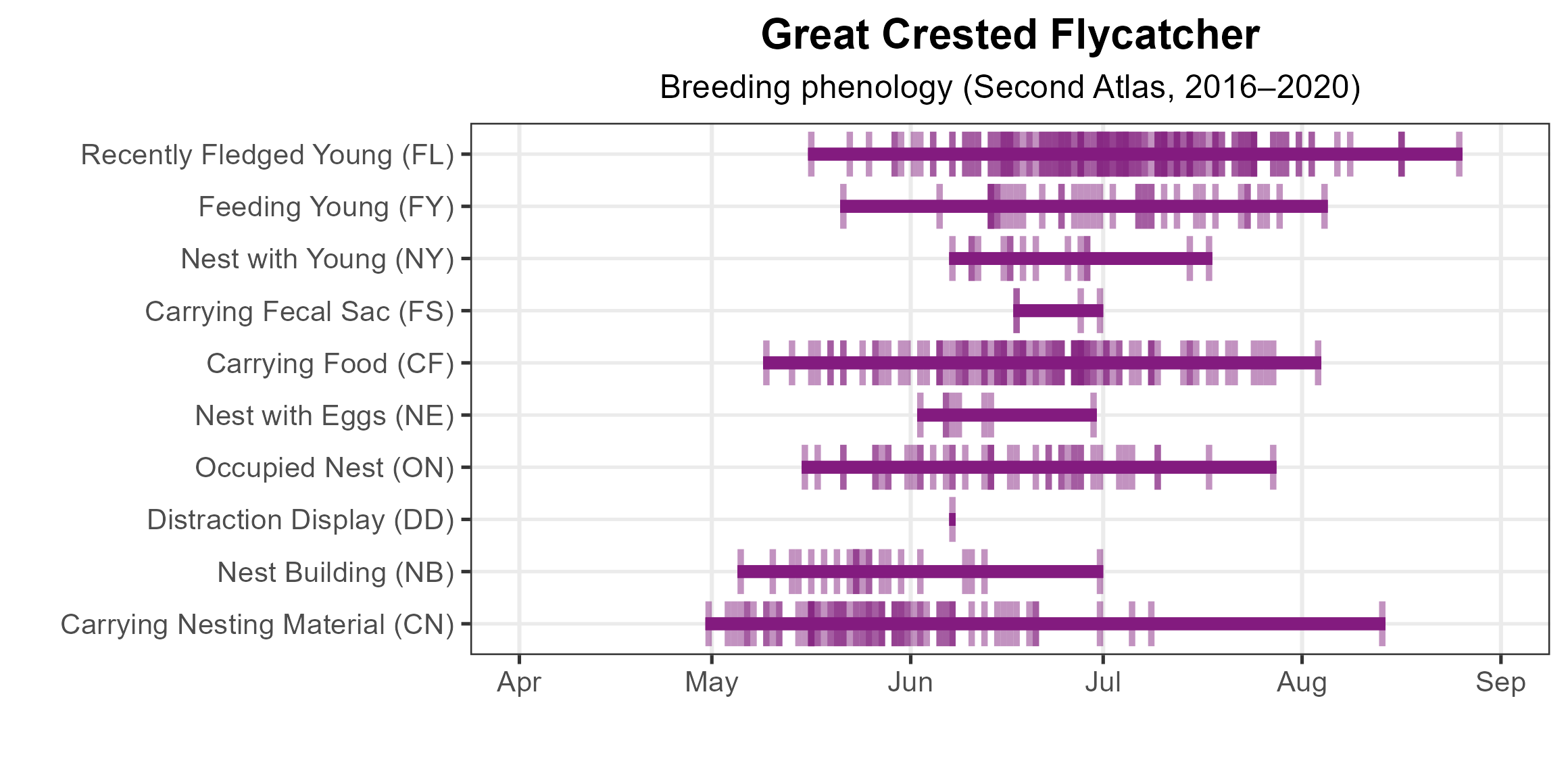 Figure 4: Great Crested Flycatcher phenology: confirmed breeding codes. This graph shows a timeline of confirmed breeding behaviors. Tick marks represent individual observations of the behavior.