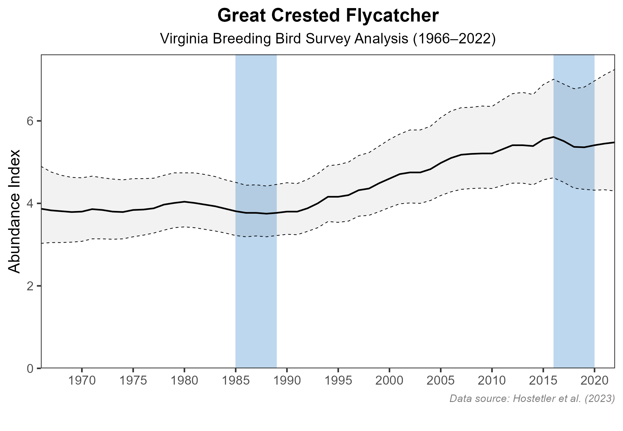 Figure 6: Great Crested Flycatcher population trend for Virginia as estimated by the North American Breeding Bird Survey. The vertical axis shows species abundance; the horizontal axis shows the year. The solid line indicates the estimated population trend; there is a 97.5% probability that the true population trend falls between the dashed lines. The shaded bars indicate the First and Second Atlas periods.