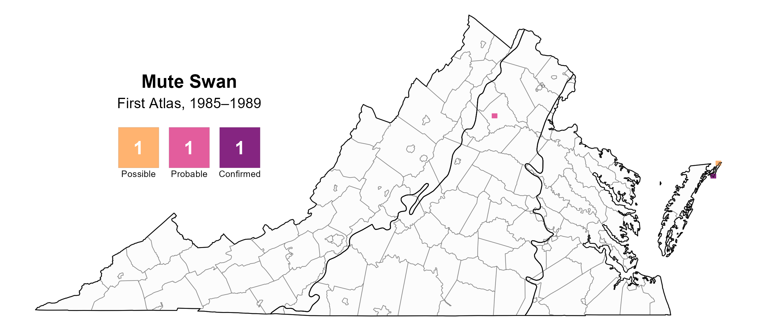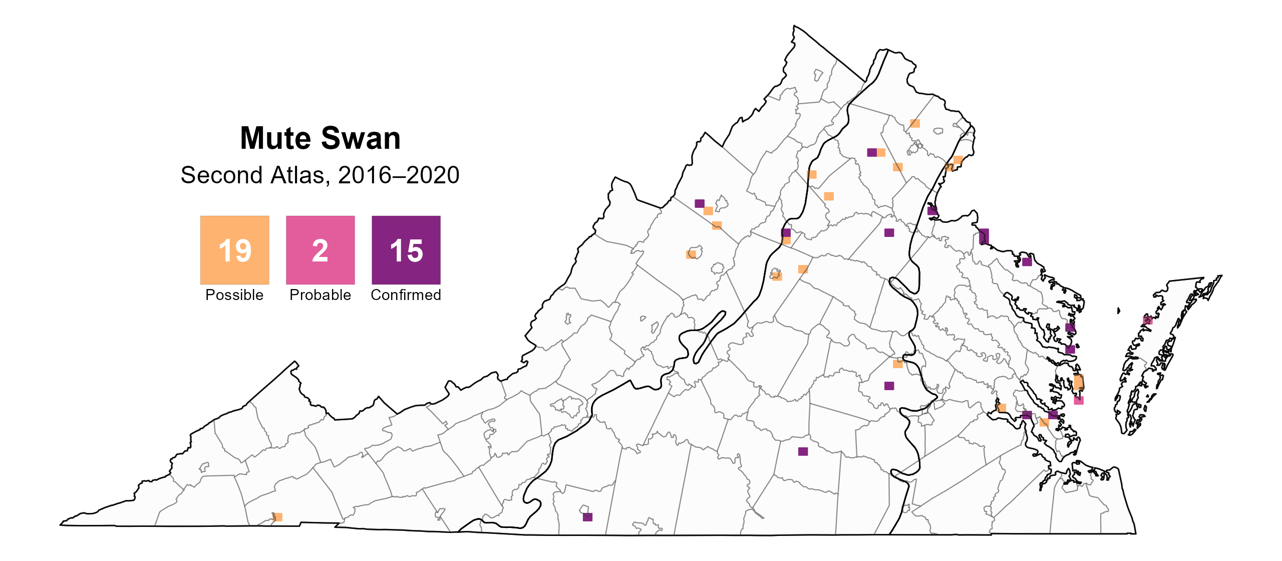 Mute Swans were confirmed breeders in 15 blocks and 13 counties and found to be probable breeders in two additional counties (Mathews and Accomack) (Figure 1). Breeding was confirmed in isolated locations, such as Lake Lanier, the city of Martinsville, and somewhat more consistently along the waterways of the Coastal Plain. During the First Atlas, there was only one documented breeding confirmation in Accomack County (Figure 2).