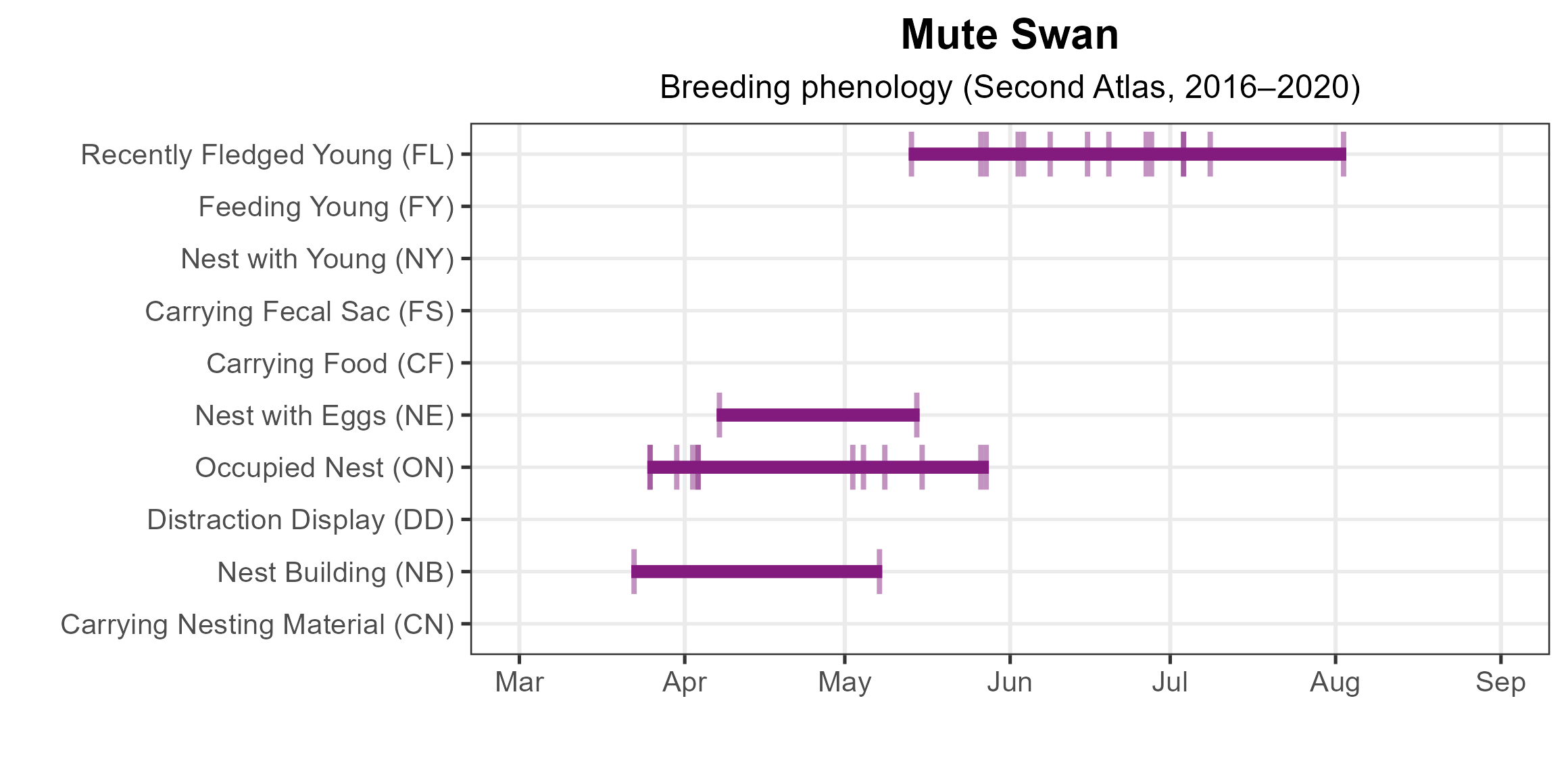 Figure 3: Mute Swan phenology: confirmed breeding codes. This graph shows a timeline of confirmed breeding behaviors. Tick marks represent individual observations of the behavior.