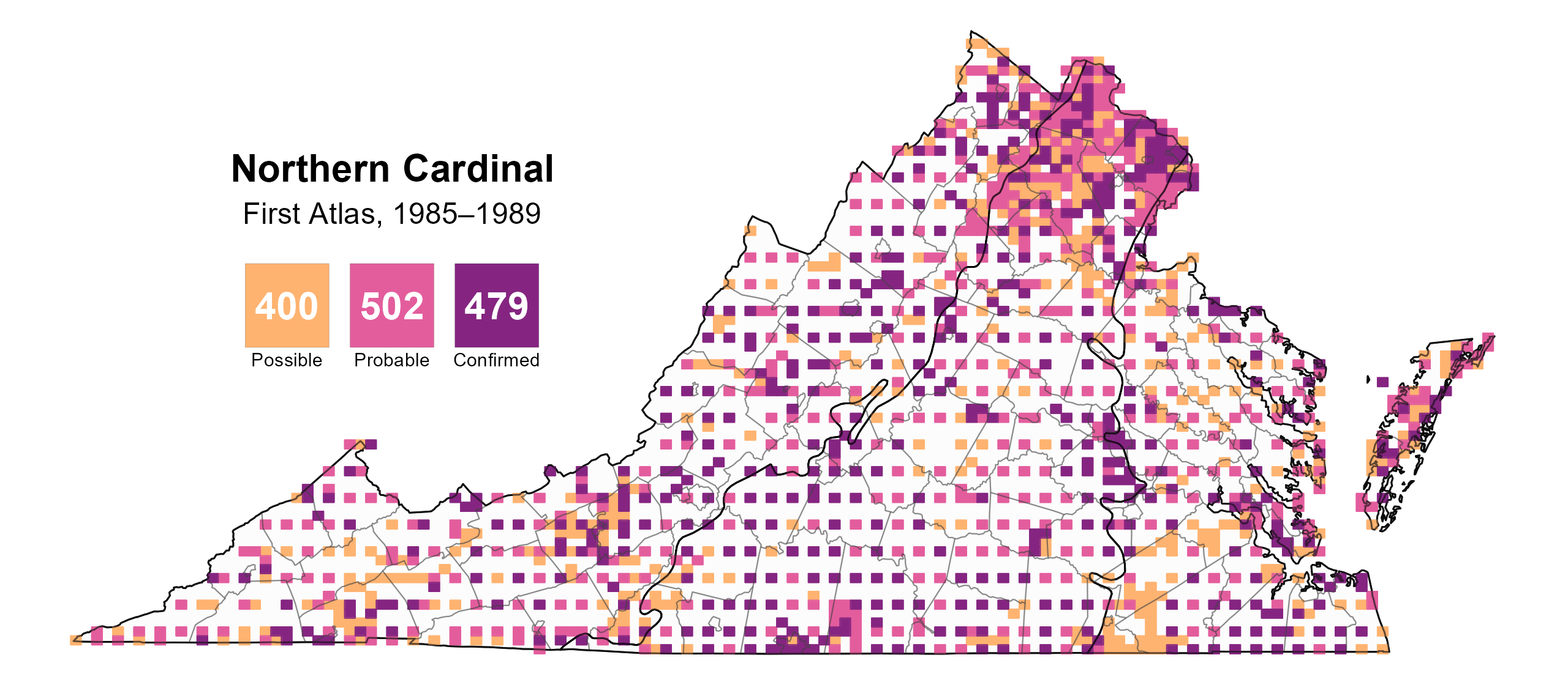 Figure 3: Northern Cardinal breeding observations from the First Atlas (1985–1989). The colored boxes illustrate Atlas blocks (approximately 10 mi2 [26 km2] survey units) where the species was detected. The colors show the highest breeding category recorded in a block. The numbers within the colors in the legend correspond to the number of blocks with that breeding evidence category.