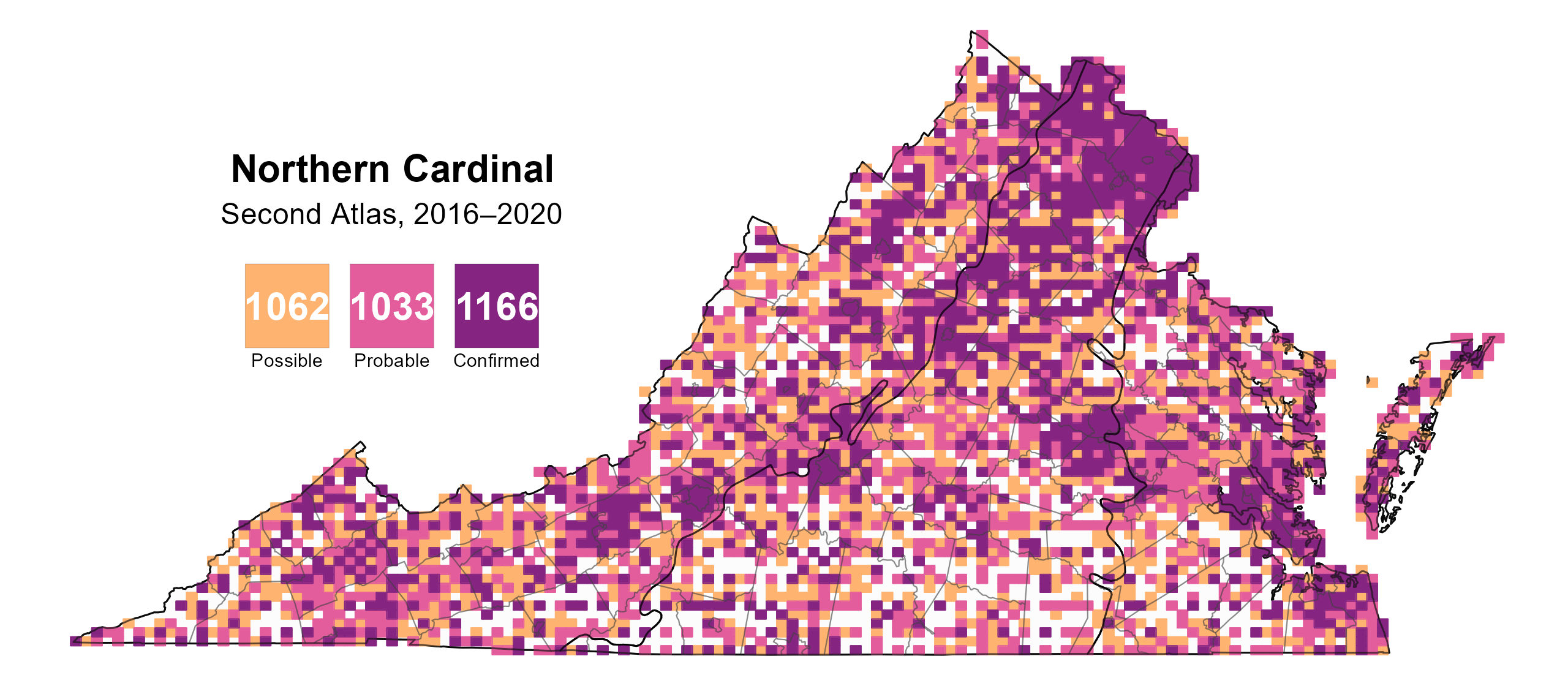 Northern Cardinals were confirmed breeders in 1,166 blocks and 129 counties, and it was a probable breeder in an additional four counties, making it a confirmed or probable breeder in all 133 counties in the state (Figure 2). During the First Atlas, it was also a confirmed breeder throughout the state (Figure 3).