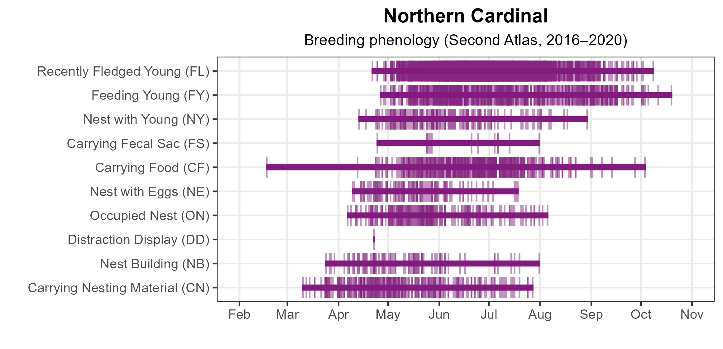 Figure 4: Northern Cardinal phenology: confirmed breeding codes. This graph shows a timeline of confirmed breeding behaviors. Tick marks represent individual observations of the behavior.