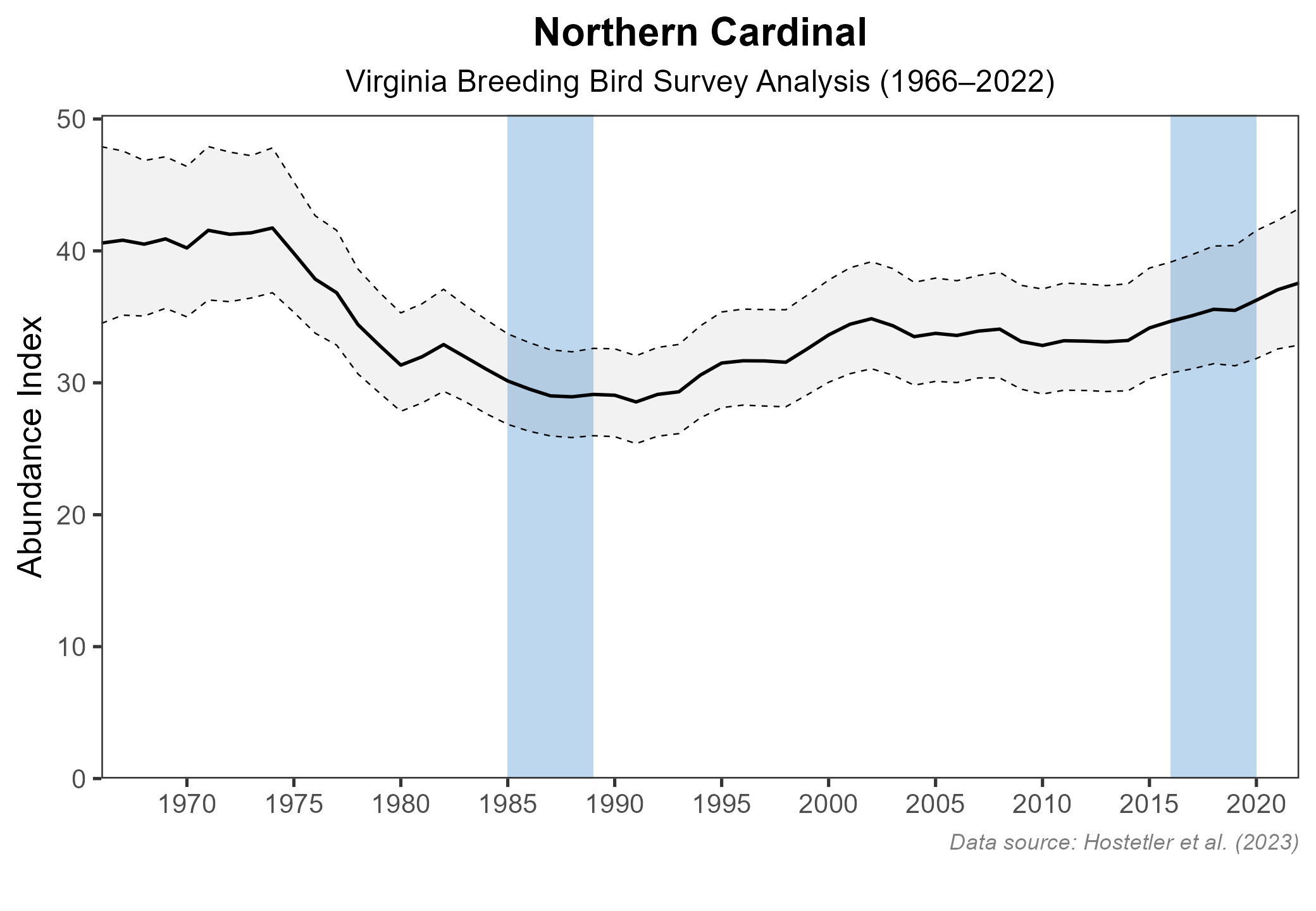 Figure 6: Northern Cardinal population trend for Virginia as estimated by the North American Breeding Bird Survey. The vertical axis shows species abundance; the horizontal axis shows the year. The solid line indicates the estimated population trend; there is a 97.5% probability that the true population trend falls between the dashed lines. The shaded bars indicate the First and Second Atlas periods.