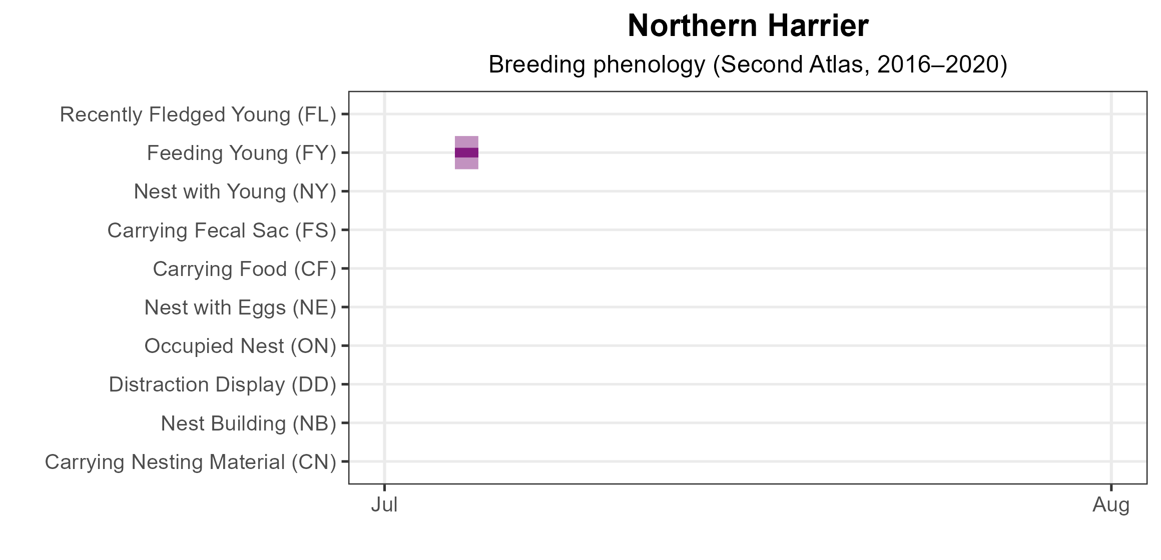 Figure 3: Northern Harrier phenology: confirmed breeding codes. This graph shows a timeline of confirmed breeding behaviors. Tick marks represent individual observations of the behavior.