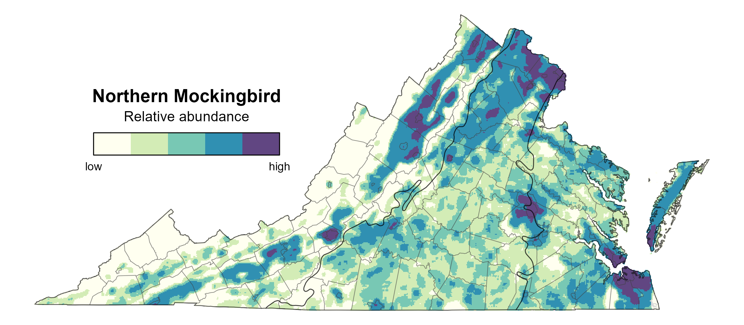 Figure 7: Northern Mockingbird relative abundance (Second Atlas, 2016–2020). This map indicates the predicted abundance of this species at a 0.4 mi2 (1 km2) scale based on environmental (including habitat) factors. Abundance values are presented on a relative scale of low to high.