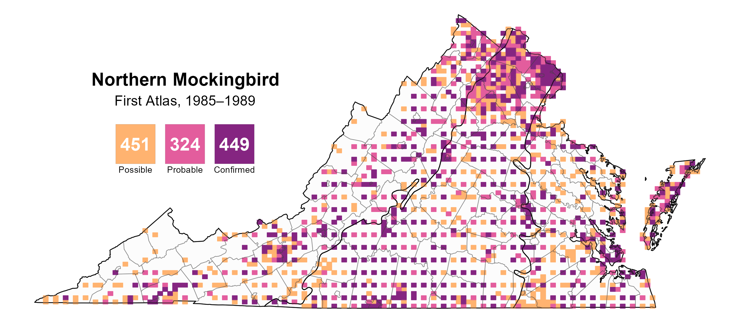 Figure 5: Northern Mockingbird breeding observations from the First Atlas (1985–1989). The colored boxes illustrate Atlas blocks (approximately 10 mi2 [26 km2] survey units) where the species was detected. The colors show the highest breeding category recorded in a block. The numbers within the colors in the legend correspond to the number of blocks with that breeding evidence category.