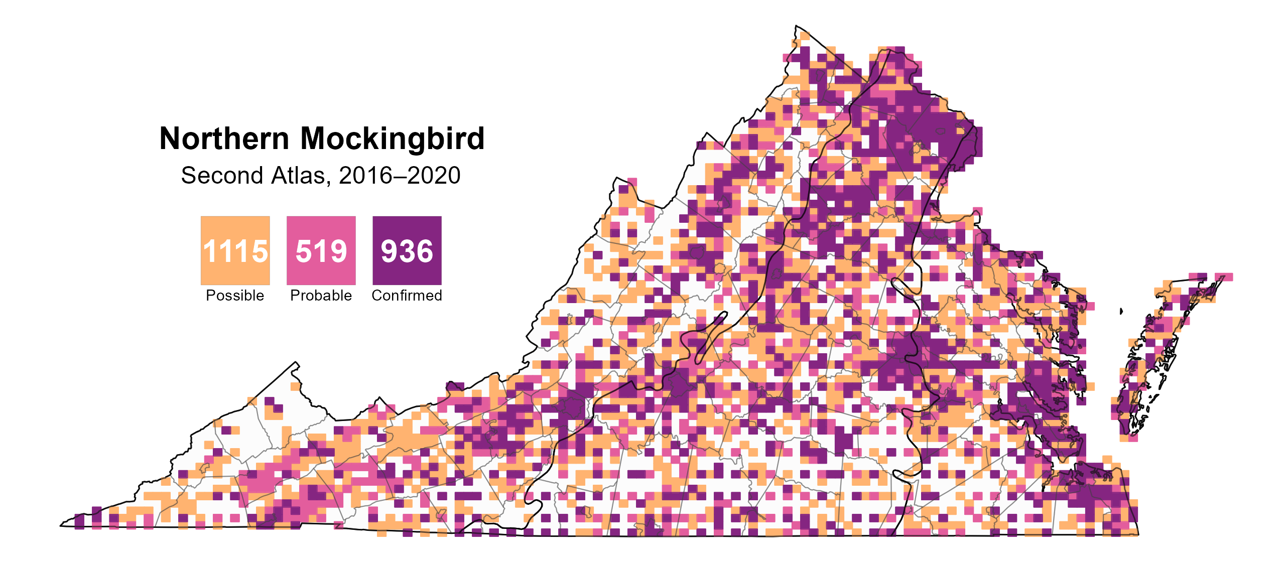 The total estimated Northern Mockingbird population in the state is approximately 952,000 individuals (with a range between 776,000 and 1,170,000). Based on the North American Breeding Bird Survey (BBS), the Northern Mockingbird population declined by a significant 1.4% annually from 1966–2022 in Virginia, and between Atlases, its population decreased by a significant 0.63% per year from 1987–2018 (Hostetler et al. 2023; Figure 8).
