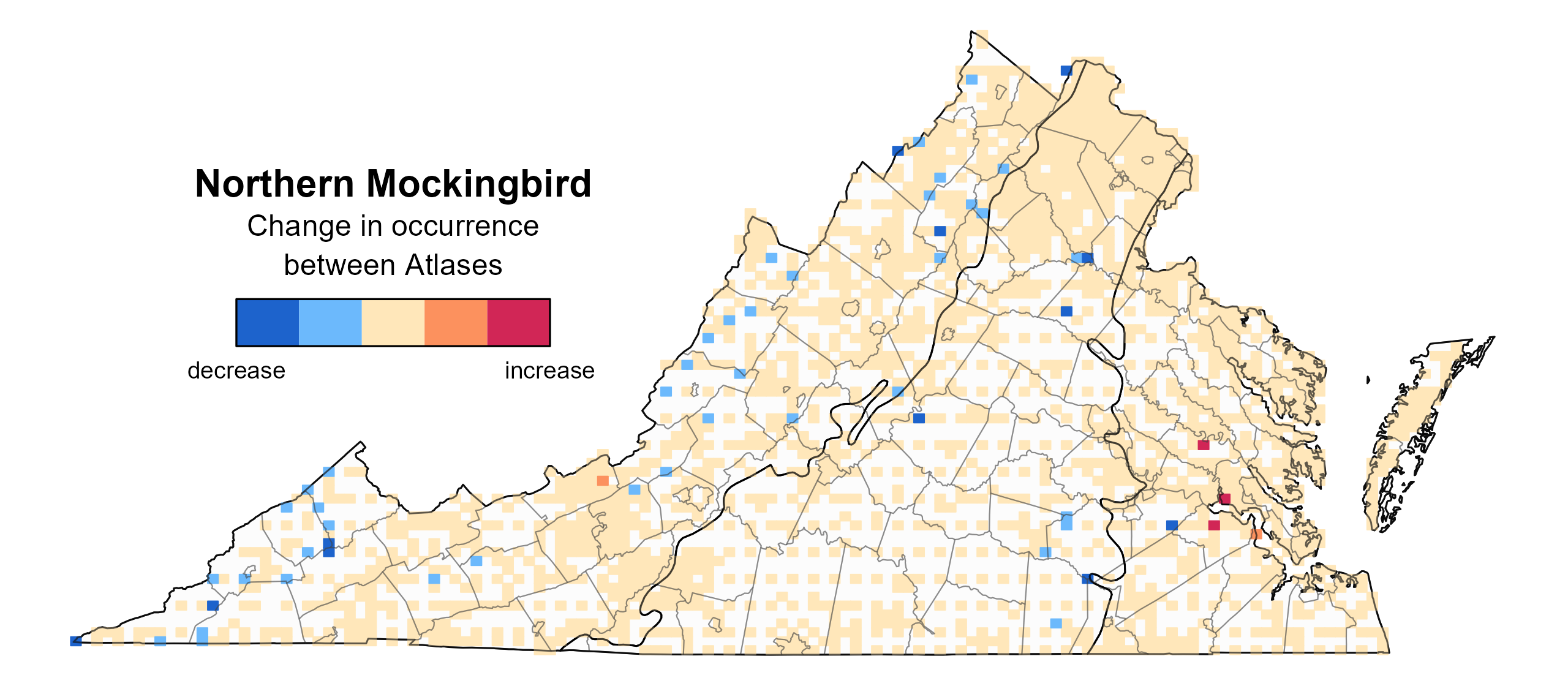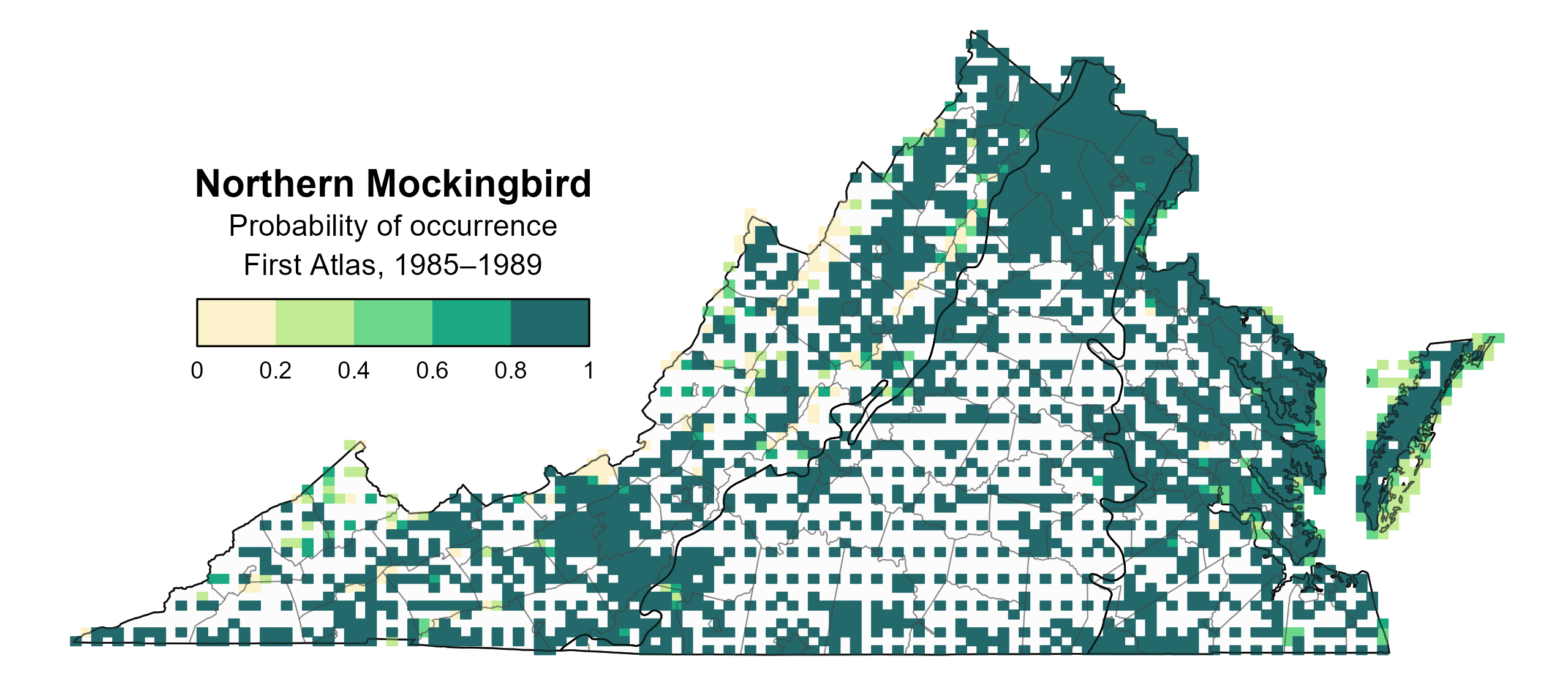Between Atlases (Figures 1 and 2), the Northern Mockingbird’s likelihood of occurrence remained constant over the entire state (Figure 3).