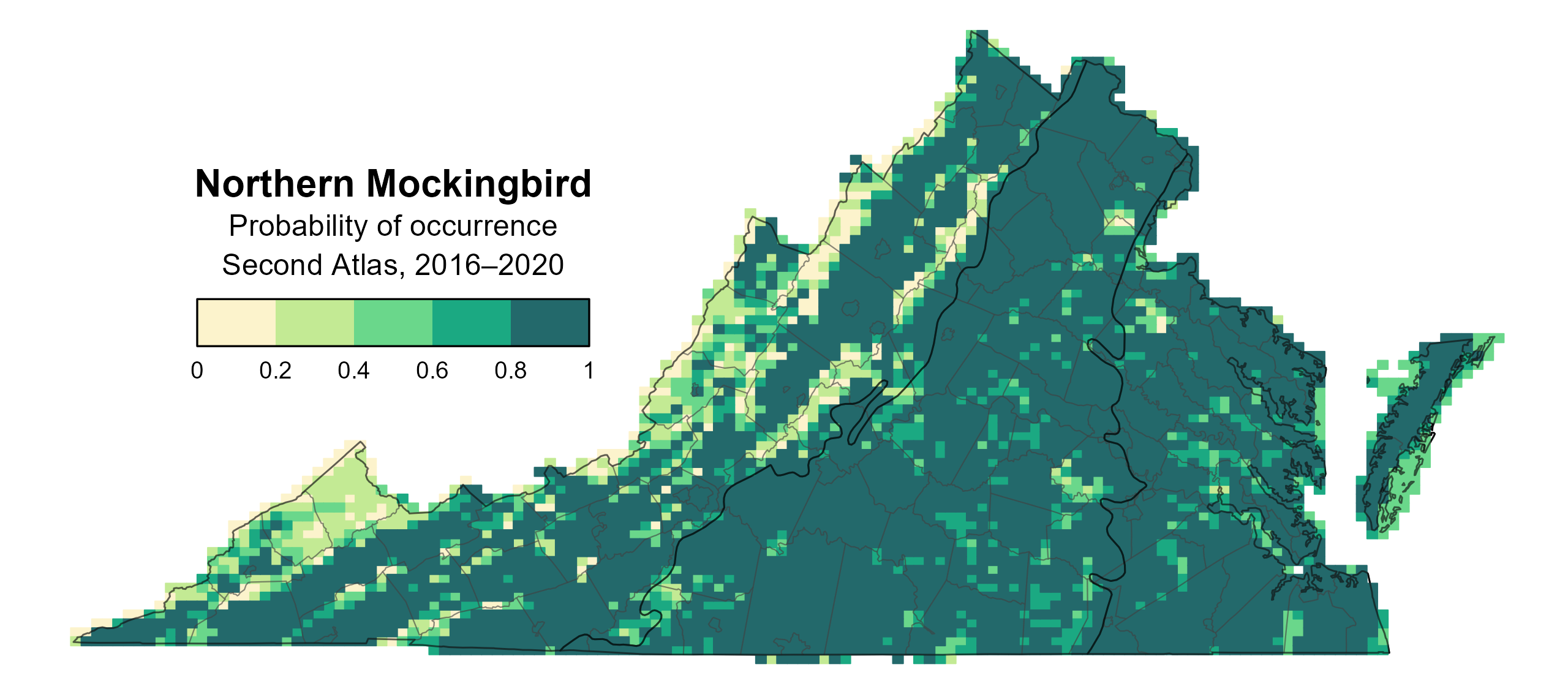 Figure 1: Northern Mockingbird breeding distribution based on probability of occurrence (Second Atlas, 2016–2020). This map indicates the probability that this species will occur in an Atlas block (an approximately 10 mi2 [26 km2] survey unit) based on environmental (including habitat) factors and after adjusting for the probability of detection (variation in survey effort among blocks).