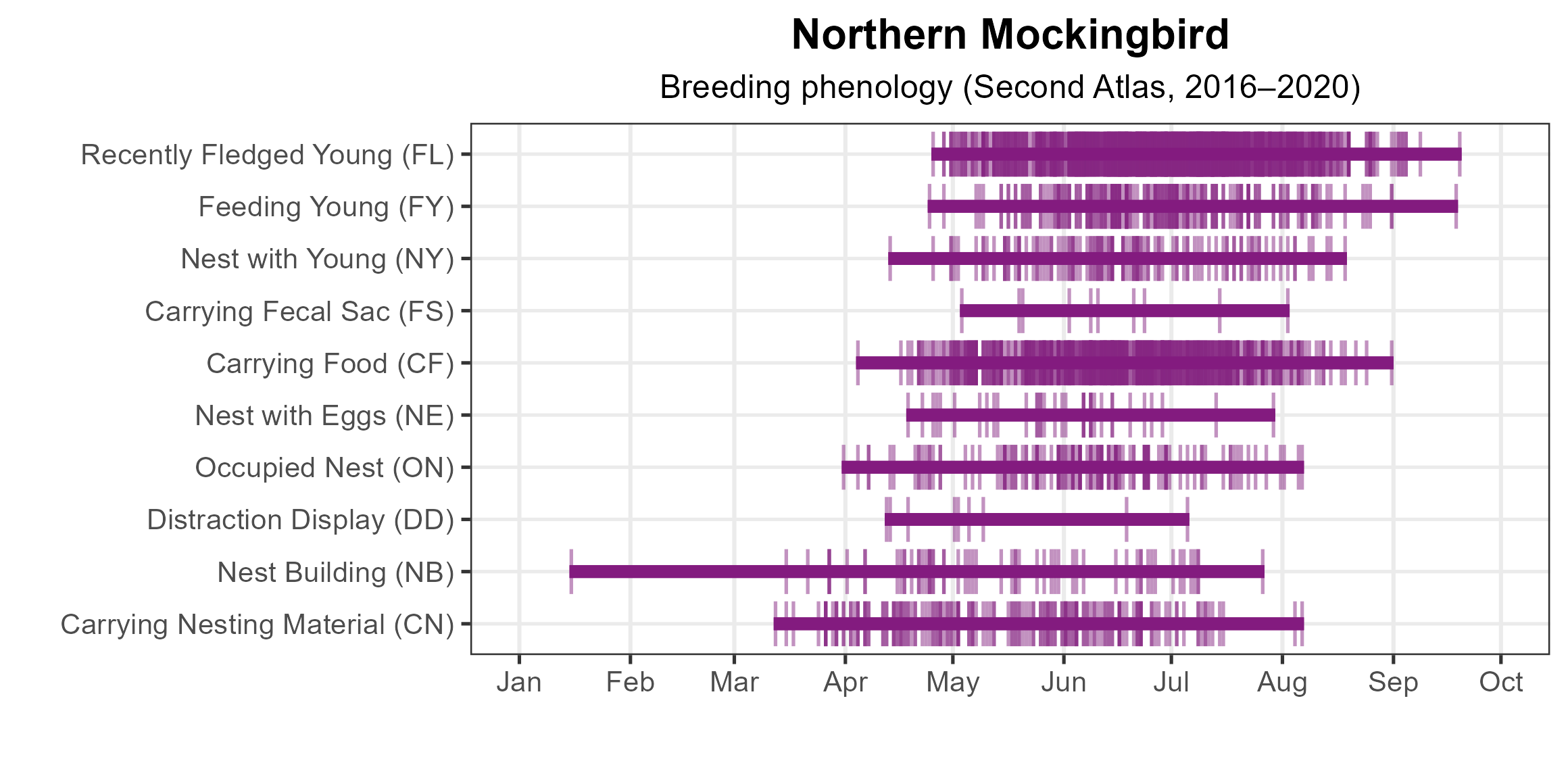 Figure 6: Northern Mockingbird phenology: confirmed breeding codes. This graph shows a timeline of confirmed breeding behaviors. Tick marks represent individual observations of the behavior.