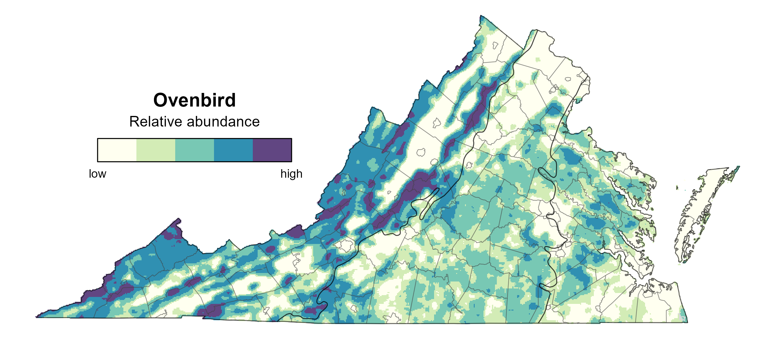 Ovenbird relative abundance was estimated to be lowest near urban and agricultural areas that lack adequate forest habitat (Figure 7). For example, the Fairfax County, Richmond, the Shenandoah Valley, and Virginia Beach had much lower predicted abundance than more forested areas of the Mountains and Valleys and central Piedmont regions.