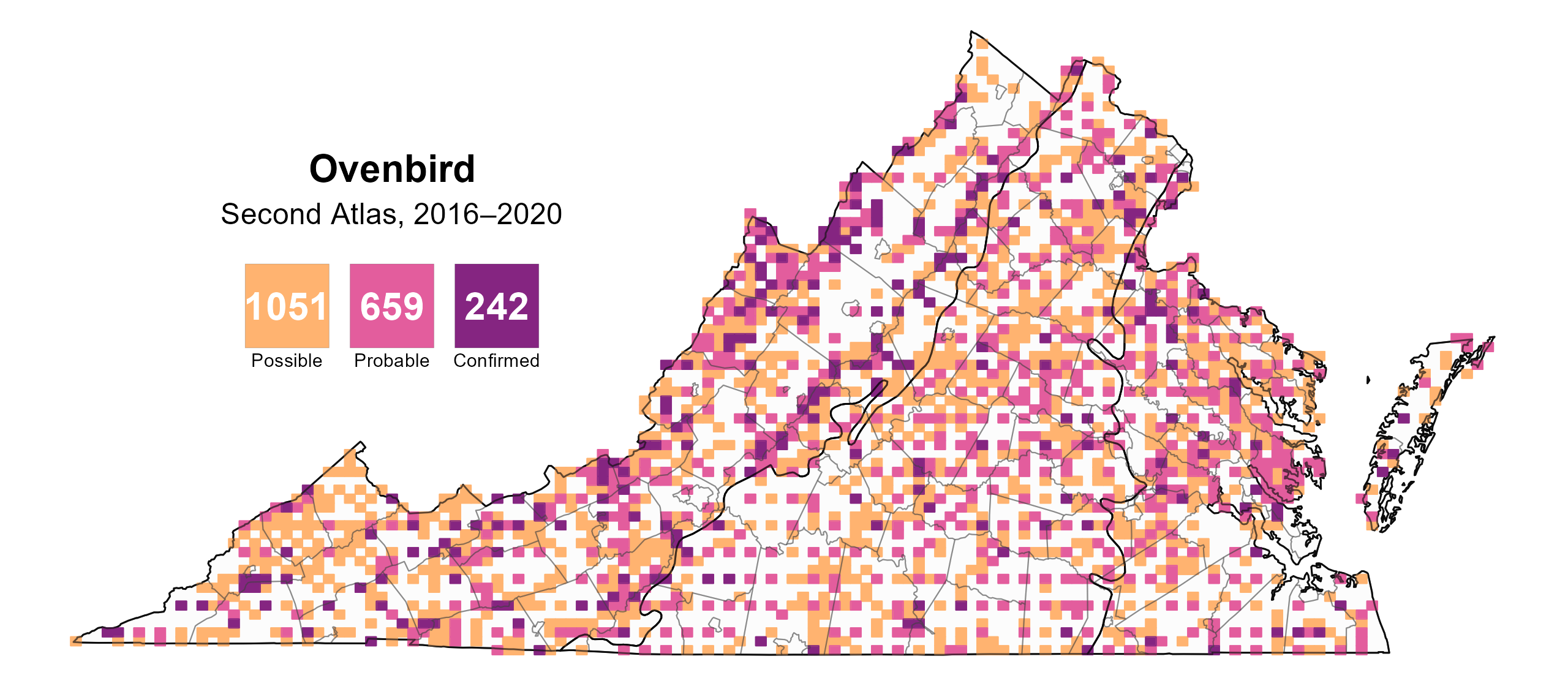 Figure 4: Ovenbird breeding observations from the Second Atlas (2016–2020). The colored boxes illustrate Atlas blocks (approximately 10 mi2 [26 km2] survey units) where the species was detected. The colors show the highest breeding category recorded in a block. The numbers within the colors in the legend correspond to the number of blocks with that breeding evidence category.