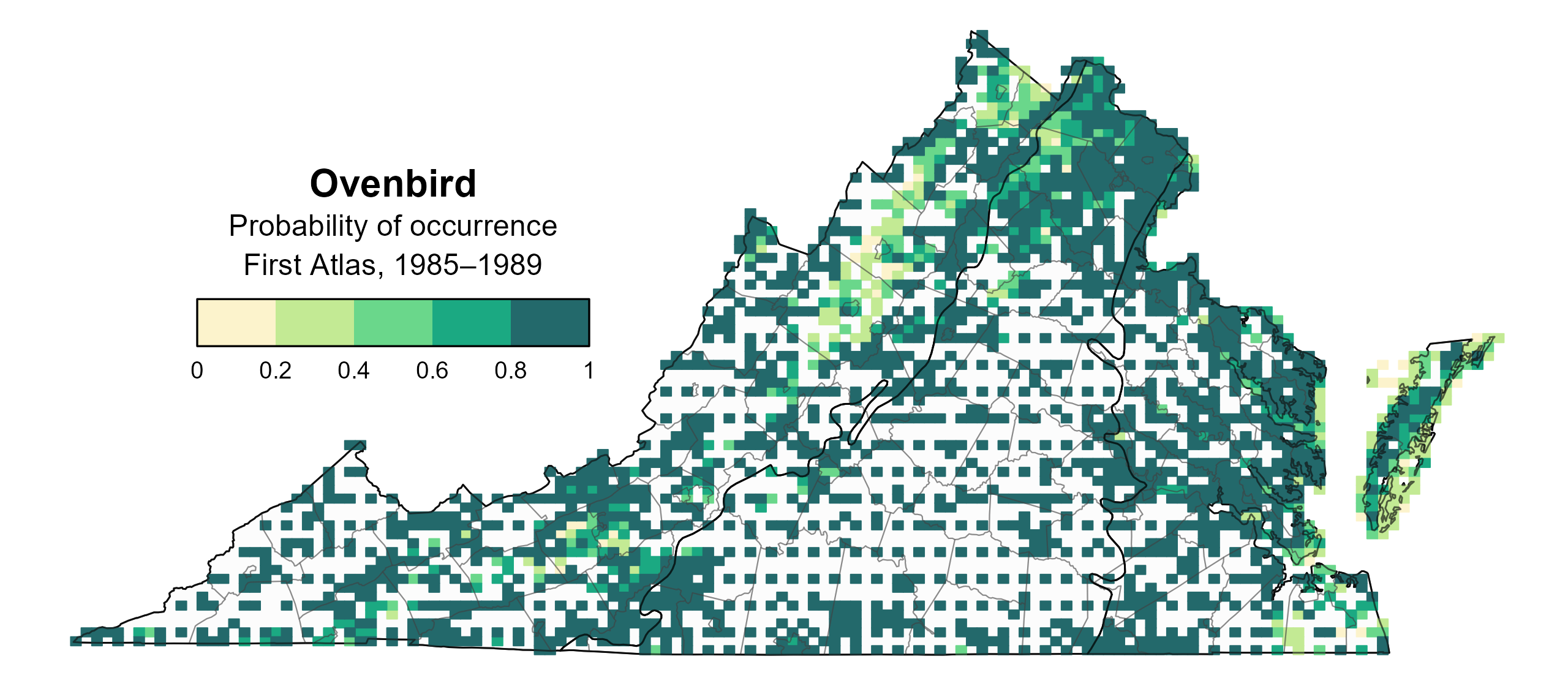Figure 2: Ovenbird breeding distribution based on probability of occurrence (First Atlas, 1985–1989). This map indicates the probability that this species will occur in an Atlas block (an approximately 10 mi2 [26 km2] survey unit) based on environmental (including habitat) factors and after adjusting for the probability of detection (variation in survey effort among blocks). Blocks in white were not surveyed during the First Atlas and were not modeled.