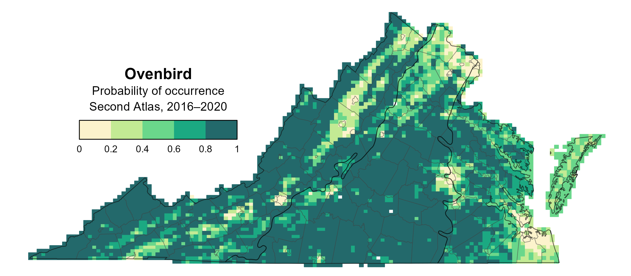 Figure 1: Ovenbird breeding distribution based on probability of occurrence (Second Atlas, 2016–2020). This map indicates the probability that this species will occur in an Atlas block (an approximately 10 mi2 [26 km2] survey unit) based on environmental (including habitat) factors and after adjusting for the probability of detection (variation in survey effort among blocks).