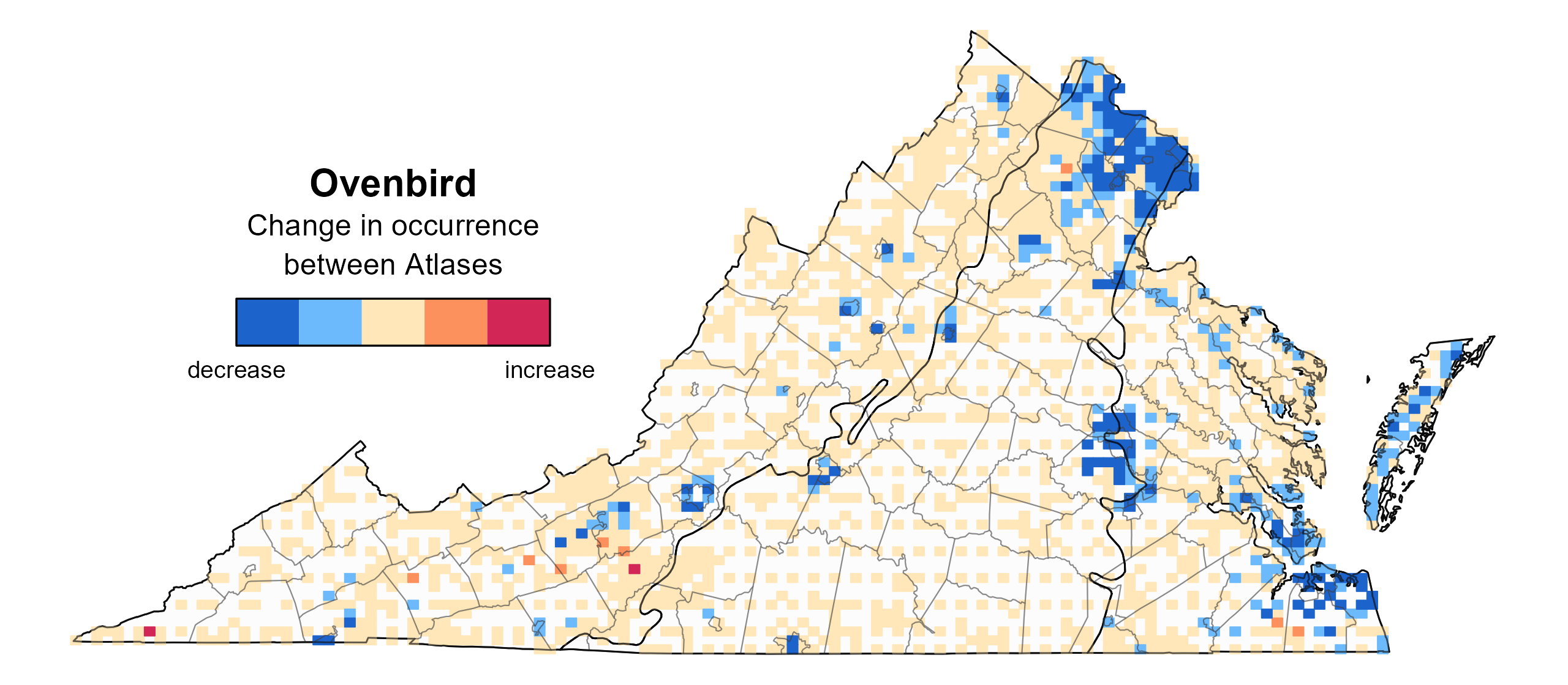 Between the First and Second Atlases (Figures 1 and 2), the Ovenbird’s likely occurrence decreased in large urban areas such as Hampton Roads-Virginia Beach, Northern Virginia, and Richmond, as well as in smaller urbanized locations across the state (Figure 3). These decreases in probable occurrence were likely associated with forest loss resulting from development. It also was less likely to occur on the Eastern Shore during the Second Atlas than during the First Atlas.