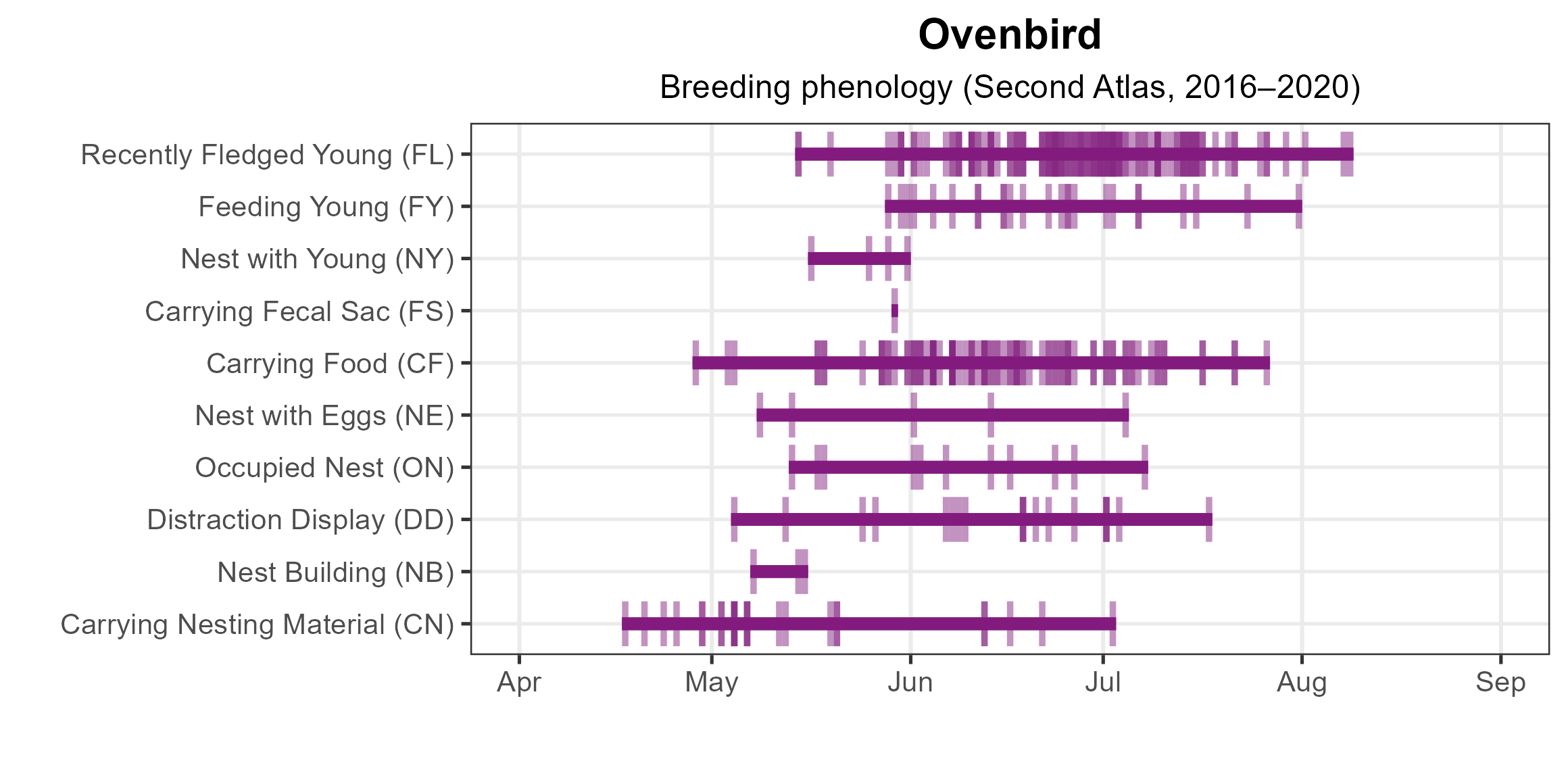 Figure 6: Ovenbird phenology: confirmed breeding codes. This graph shows a timeline of confirmed breeding behaviors. Tick marks represent individual observations of the behavior.