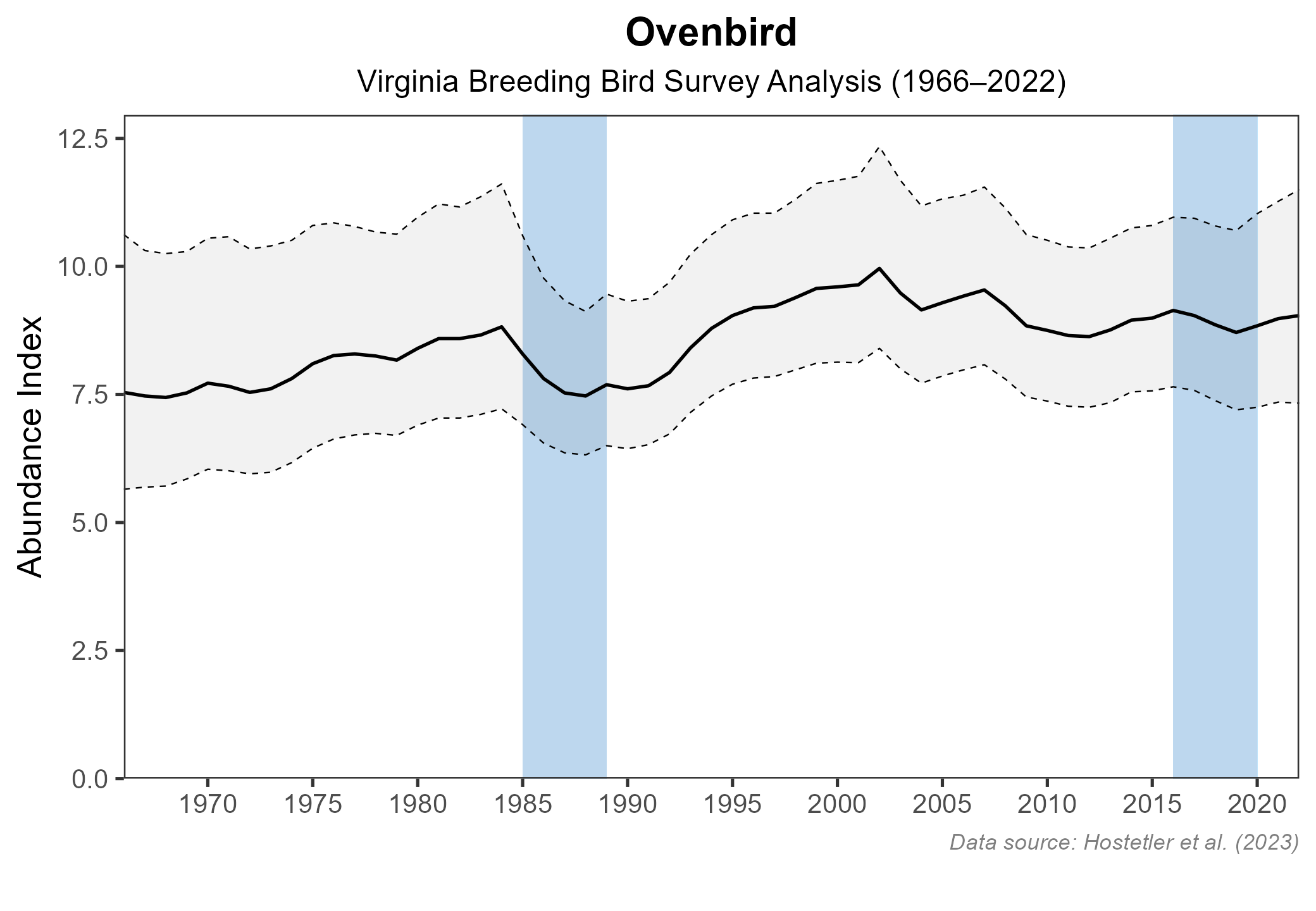 Figure 8: Ovenbird population trend for Virginia as estimated by the North American Breeding Bird Survey. The vertical axis shows species abundance; the horizontal axis shows the year. The solid line indicates the estimated population trend; there is a 97.5% probability that the true population trend falls between the dashed lines. The shaded bars indicate the First and Second Atlas periods.
