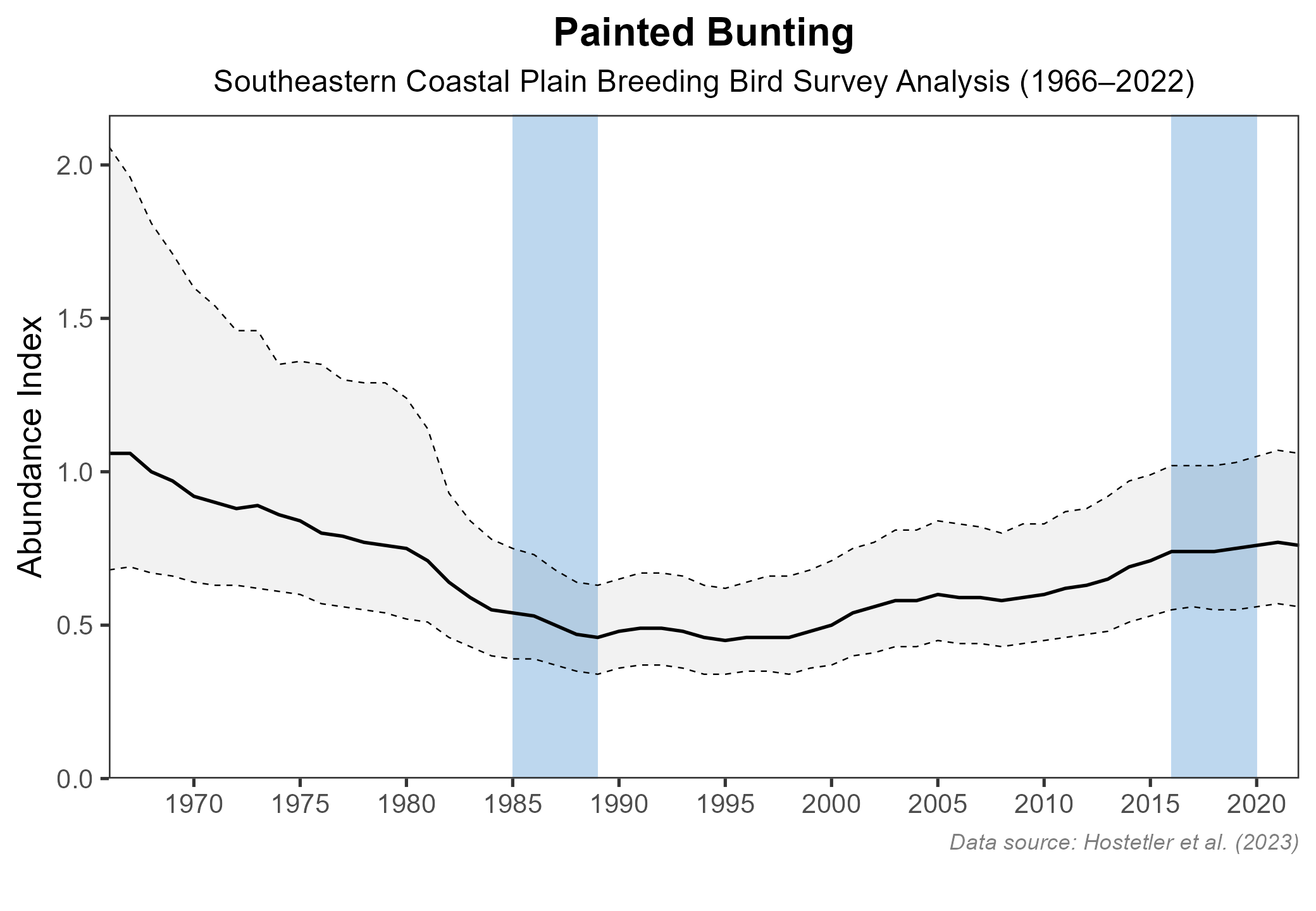 The increasing number of sightings in Virginia over the past several decades, coupled with the discovery of a small breeding population, suggests the species may be increasing in the state. The North American Breeding Bird Survey (BBS) showed no significant change within the southeastern Coastal Plain region, with a decrease of 0.56% per year from 1966–2021; however, BBS data are sparse for the eastern population (Sauer et al. 2022). Despite this apparent stability in the region, Painted Buntings face several threats (see the Conservation section).