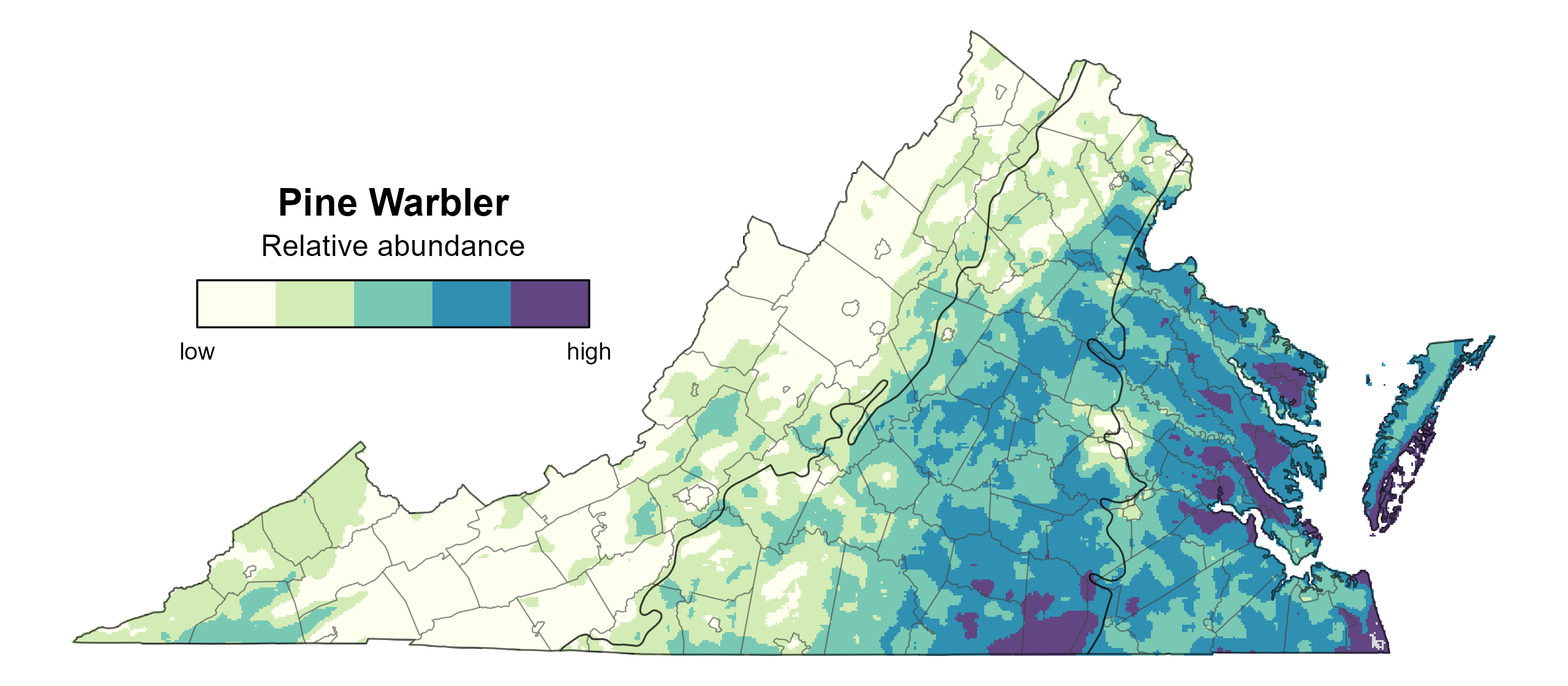 Pine Warbler relative abundance was estimated to be highest in the forested areas of the Coastal Plain and Piedmont regions (Figure 7). In the Piedmont region, abundance was lower in the northern and southwestern sections and the highly developed area around Richmond. Abundance in the Mountains and Valleys region was generally low and variable, with some areas of moderate abundance where coniferous forest is present.