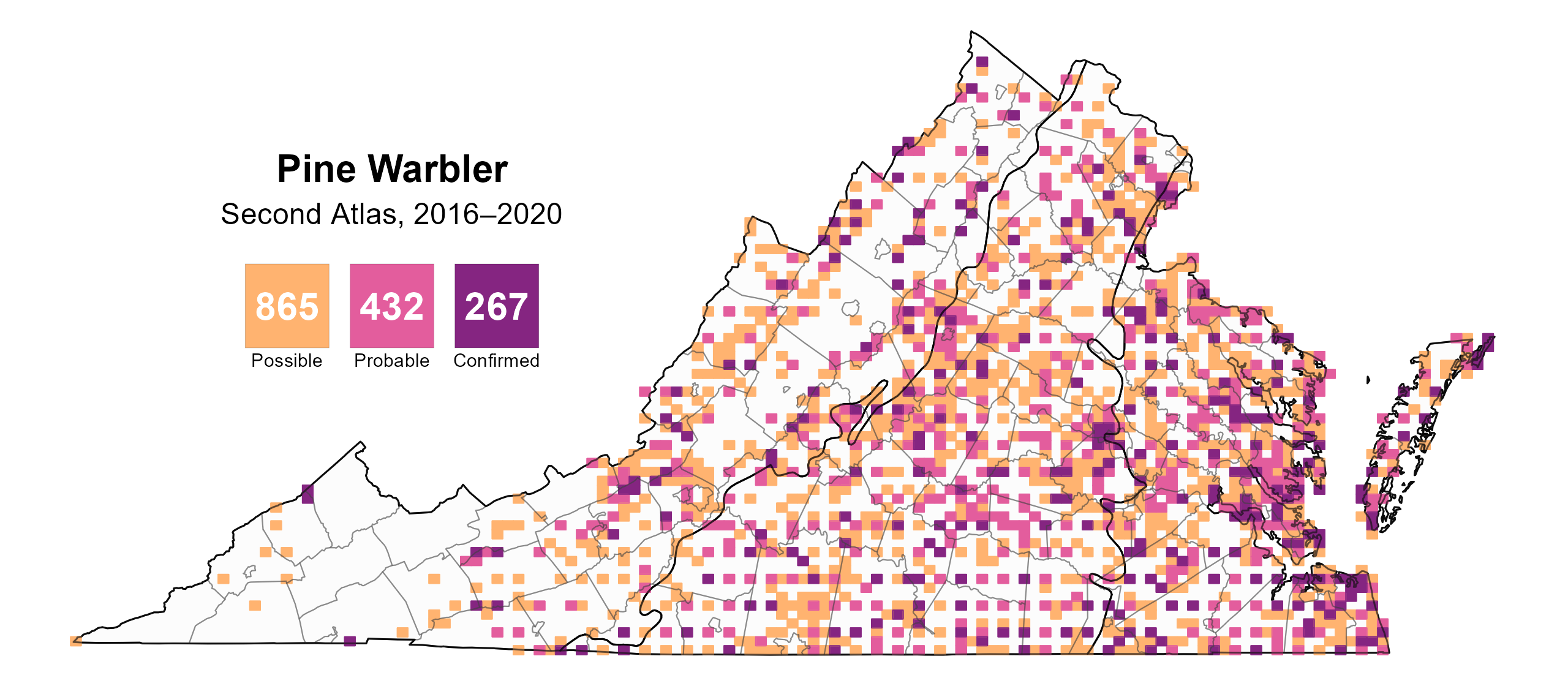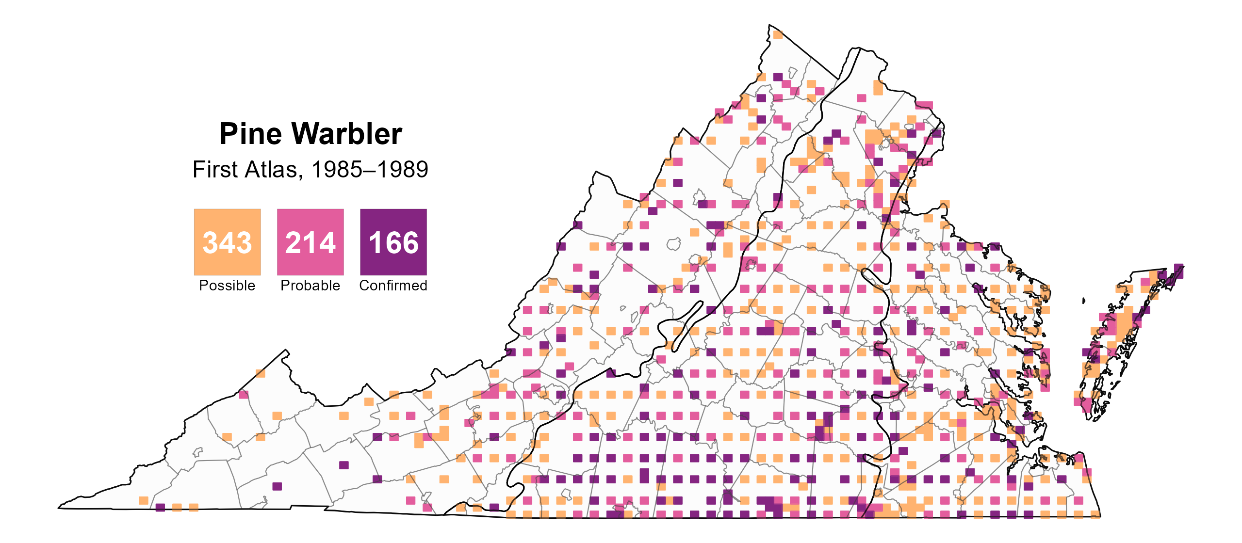 Pine Warblers are distributed throughout Virginia, but they are most likely to occur in pine forests in the central and southern Piedmont region and in the Coastal Plain region (Figure 1). In the Mountains and Valleys region, occurrence is lower overall and more variable, except in the southwestern corner, where they are often found in pine plantations (Rottenborn and Brinkley 2007). They are generally absent in the valleys that are dominated by agricultural and in developed areas.