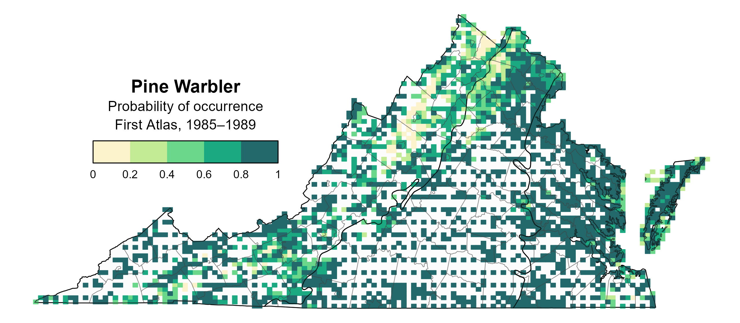 Figure 2: Pine Warbler breeding distribution based on probability of occurrence (First Atlas, 1985–1989). This map indicates the probability that this species will occur in an Atlas block (an approximately 10 mi2 [26 km2] survey unit) based on environmental (including habitat) factors and after adjusting for the probability of detection (variation in survey effort among blocks). Blocks in white were not surveyed during the First Atlas and were not modeled.