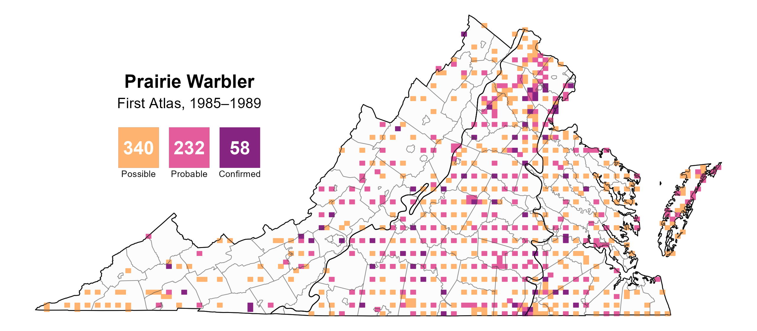 Figure 5: Prairie Warbler breeding observations from the First Atlas (1985–1989). The colored boxes illustrate Atlas blocks (approximately 10 mi2 [26 km2] survey units) where the species was detected. The colors show the highest breeding category recorded in a block. The numbers within the colors in the legend correspond to the number of blocks with that breeding evidence category.