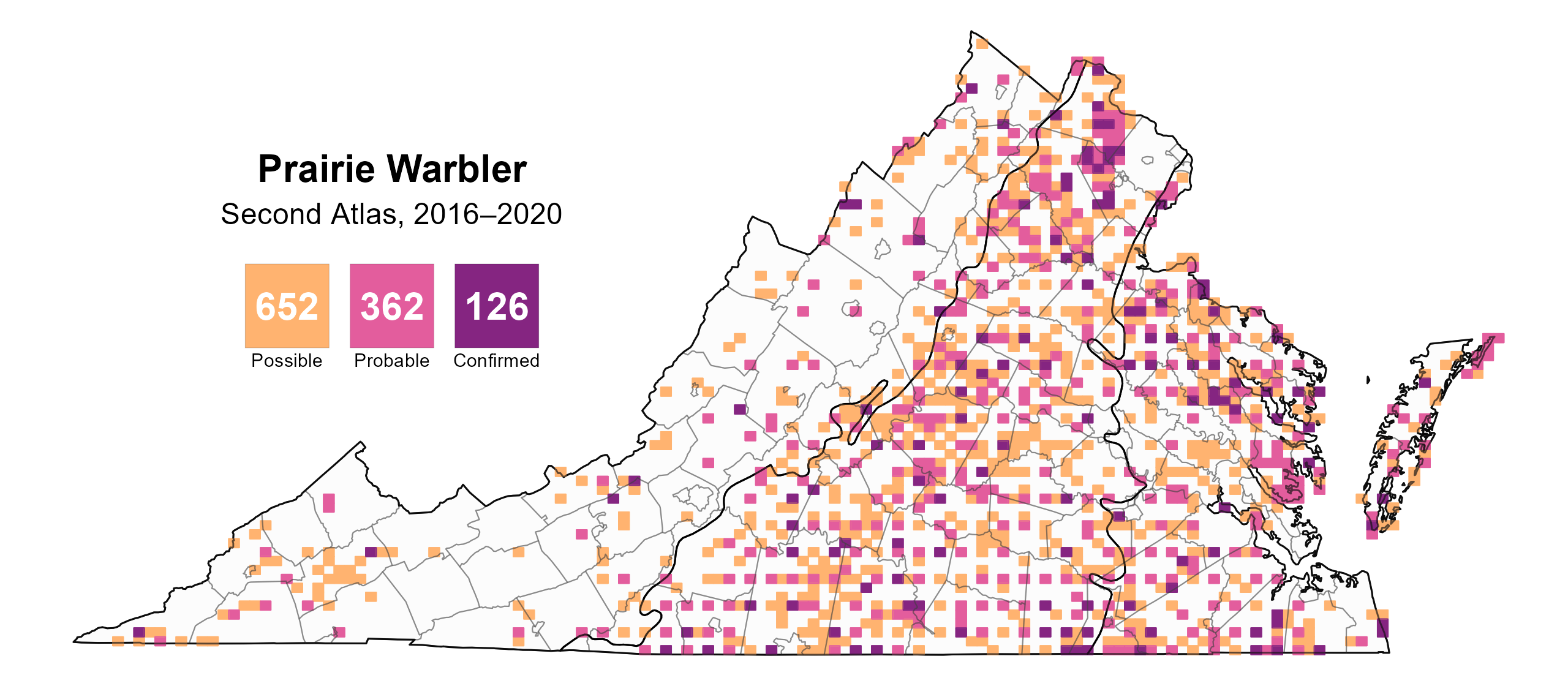 Figure 4: Prairie Warbler breeding observations from the Second Atlas (2016–2020). The colored boxes illustrate Atlas blocks (approximately 10 mi2 [26 km2] survey units) where the species was detected. The colors show the highest breeding category recorded in a block. The numbers within the colors in the legend correspond to the number of blocks with that breeding evidence category.