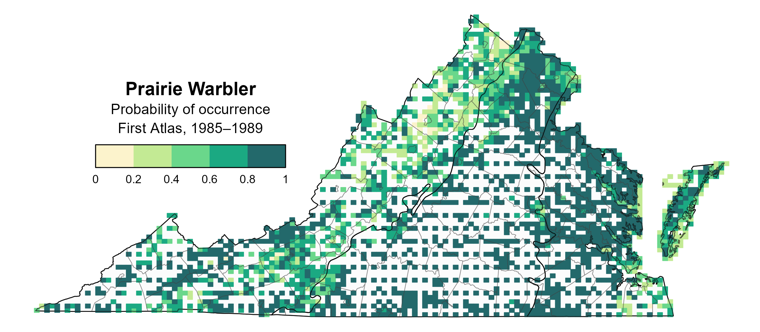 Figure 2: Prairie Warbler breeding distribution based on probability of occurrence (First Atlas, 1985–1989). This map indicates the probability that this species will occur in an Atlas block (an approximately 10 mi2 [26 km2] survey unit) based on environmental (including habitat) factors and after adjusting for the probability of detection (variation in survey effort among blocks). Blocks in white were not surveyed during the First Atlas and were not modeled.