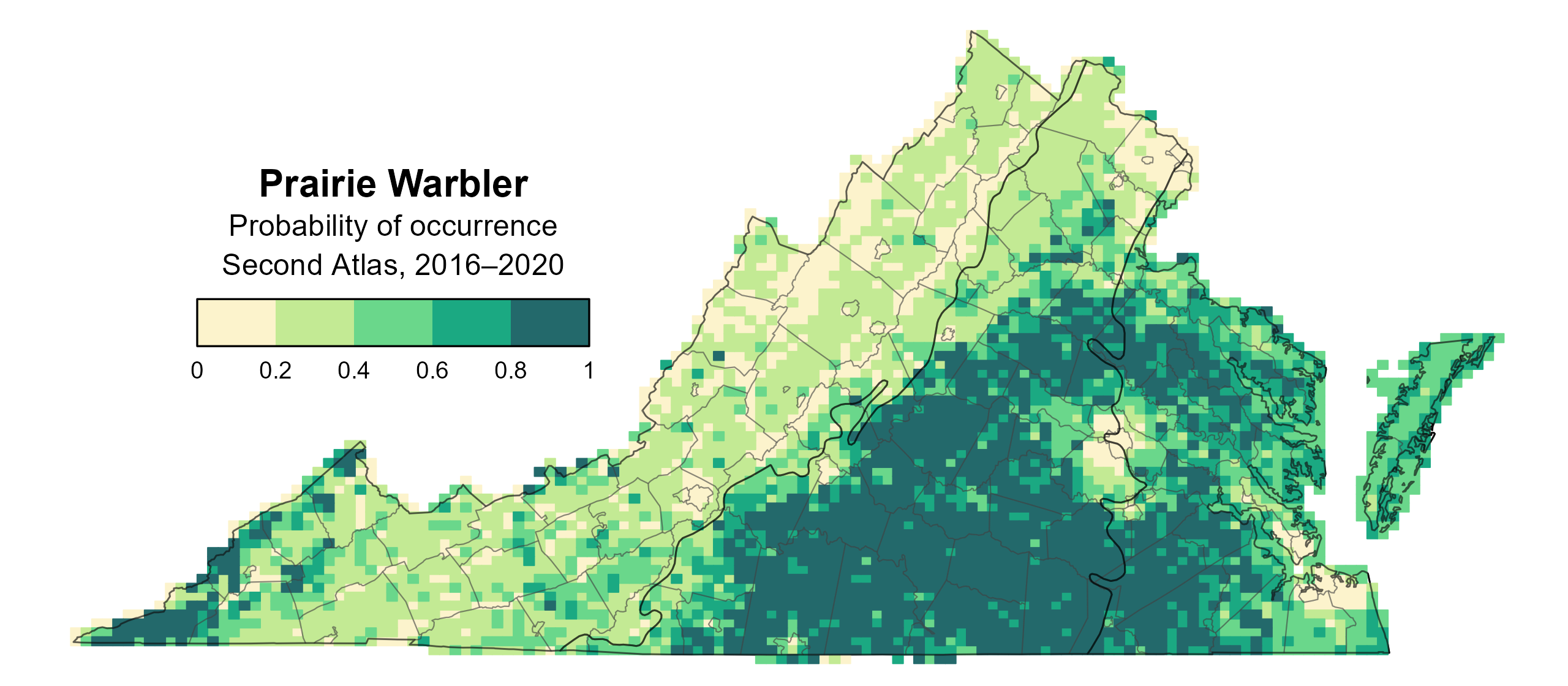 Figure 1: Prairie Warbler breeding distribution based on probability of occurrence (Second Atlas, 2016–2020). This map indicates the probability that this species will occur in an Atlas block (an approximately 10 mi2 [26 km2] survey unit) based on environmental (including habitat) factors and after adjusting for the probability of detection (variation in survey effort among blocks).