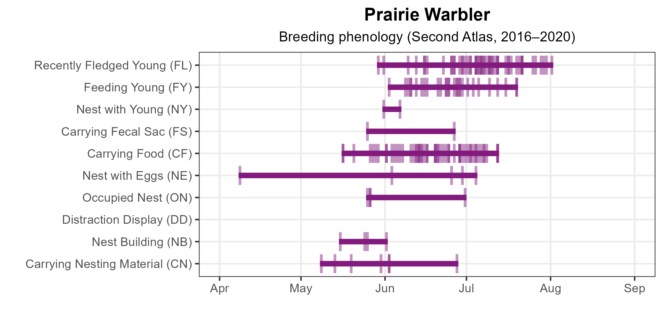 Figure 6: Prairie Warbler phenology: confirmed breeding codes. This graph shows a timeline of confirmed breeding behaviors. Tick marks represent individual observations of the behavior.