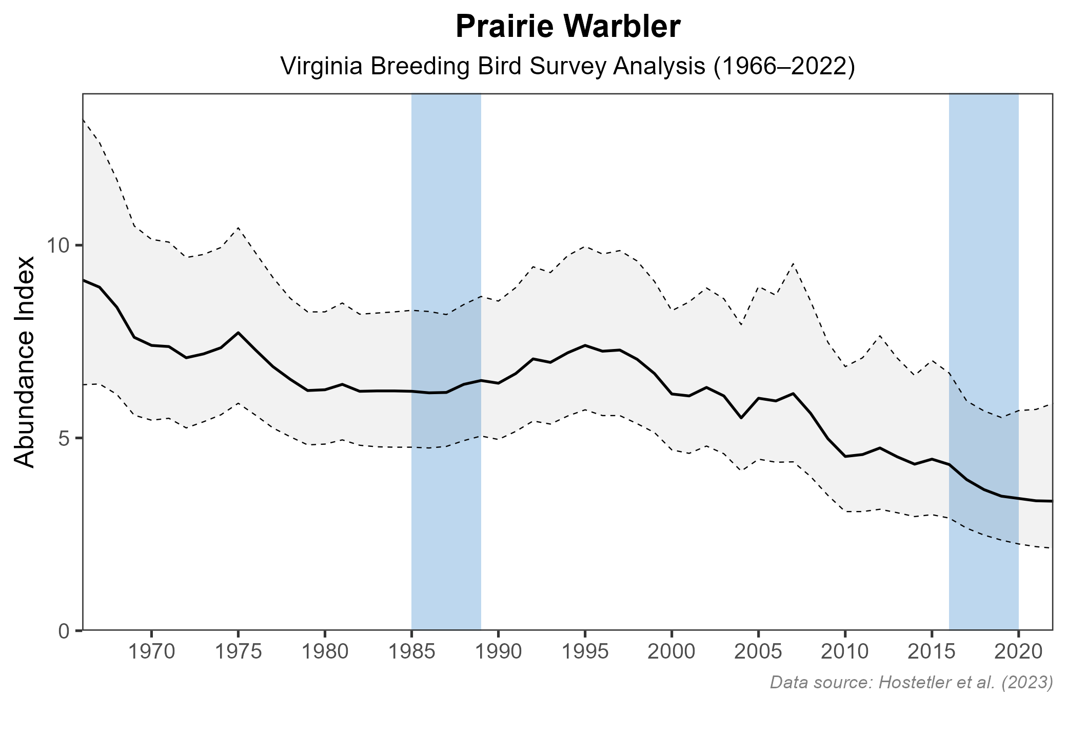 The total estimated Prairie Warbler population in the state is approximately 214,000 individuals (with a range between 158,000 and 297,000). Based on the North American Breeding Bird Survey (BBS), the Prairie Warbler population decreased by a significant 1.76% annually from 1966–2022 in Virginia, and between Atlases, its population decreased by a similar significant rate of 1.7% per year from 1987–2018 (Hostetler et al. 2023; Figure 8).