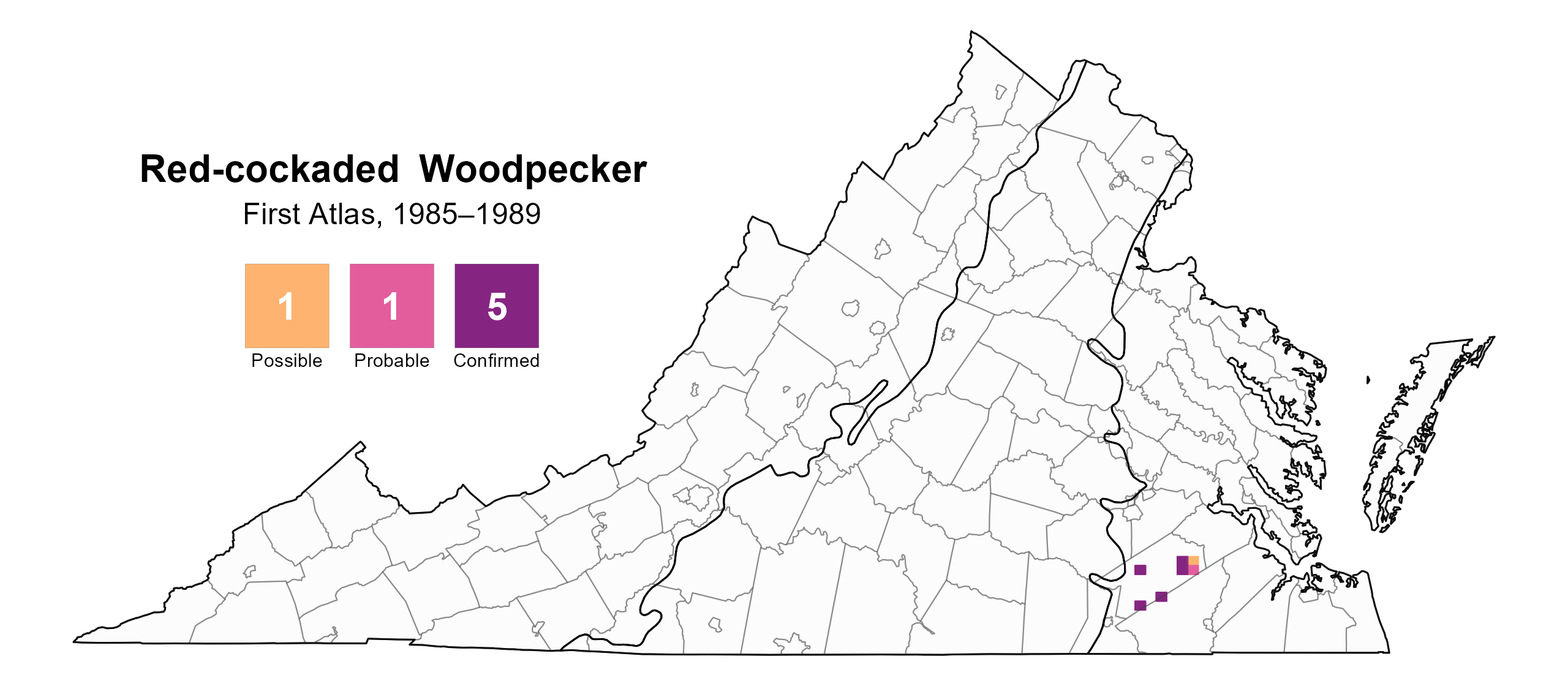 Figure 2: Red-cockaded Woodpecker breeding observations from the First Atlas (1985–1989). The colored boxes illustrate Atlas blocks (approximately 10 mi2 [26 km2] survey units) where the species was detected. The colors show the highest breeding category recorded in a block. The numbers within the colors in the legend correspond to the number of blocks with that breeding evidence category.