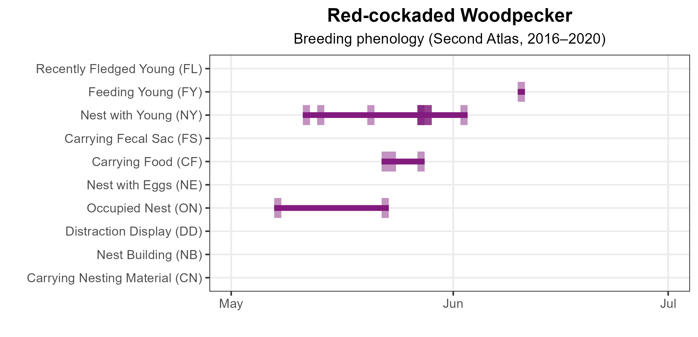 Because Atlas observers seldomly had access to the species and because they nest in cavities, information on their breeding phenology is limited. Atlas volunteers documented occupied nests starting from May 7, with adults seen feeding young through June 10 (Figure 3). The true distribution of breeding behaviors likely extends earlier and later than these dates, but because there are so few birds and most are not in publicly accessible areas, there was a small sample size. Researchers use dedicated tools to observe activity inside the cavity, such as telescoping poles with cameras to count eggs and nestlings. For more general information on the breeding habits of the Red-cockaded Woodpecker, please refer to All About Birds.