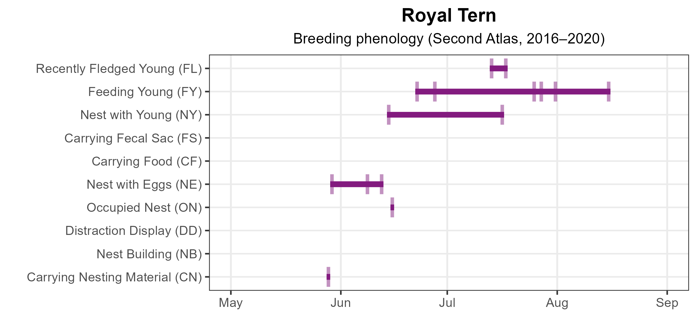 Figure 3: Royal Tern phenology: confirmed breeding codes. This graph shows a timeline of confirmed breeding behaviors. Tick marks represent individual observations of the behavior.