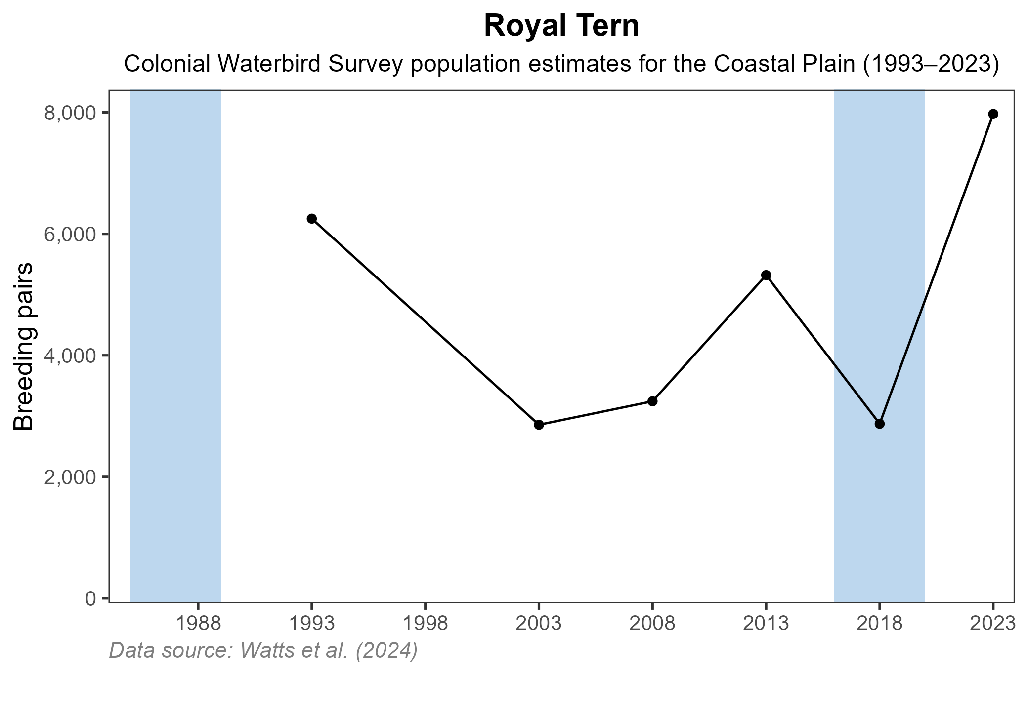 Figure 4: Royal Tern population trend for Virginia’s Coastal Plain. This chart illustrates the number of breeding pairs as estimated by the Virginia Colonial Waterbird Survey (Watts et al. 2024). A data point is not included for 1998, as the Survey covered a smaller geographic area in that year. The vertical light blue bars represent the periods corresponding to the First Atlas (1985–1989) and Second Atlas (2016–2020).