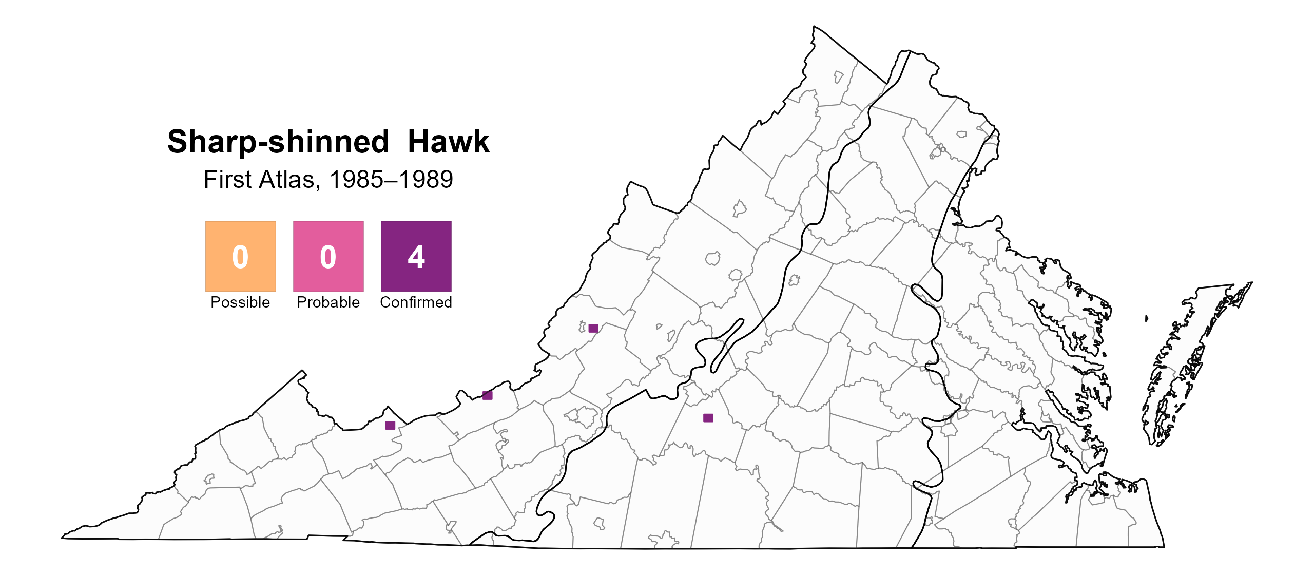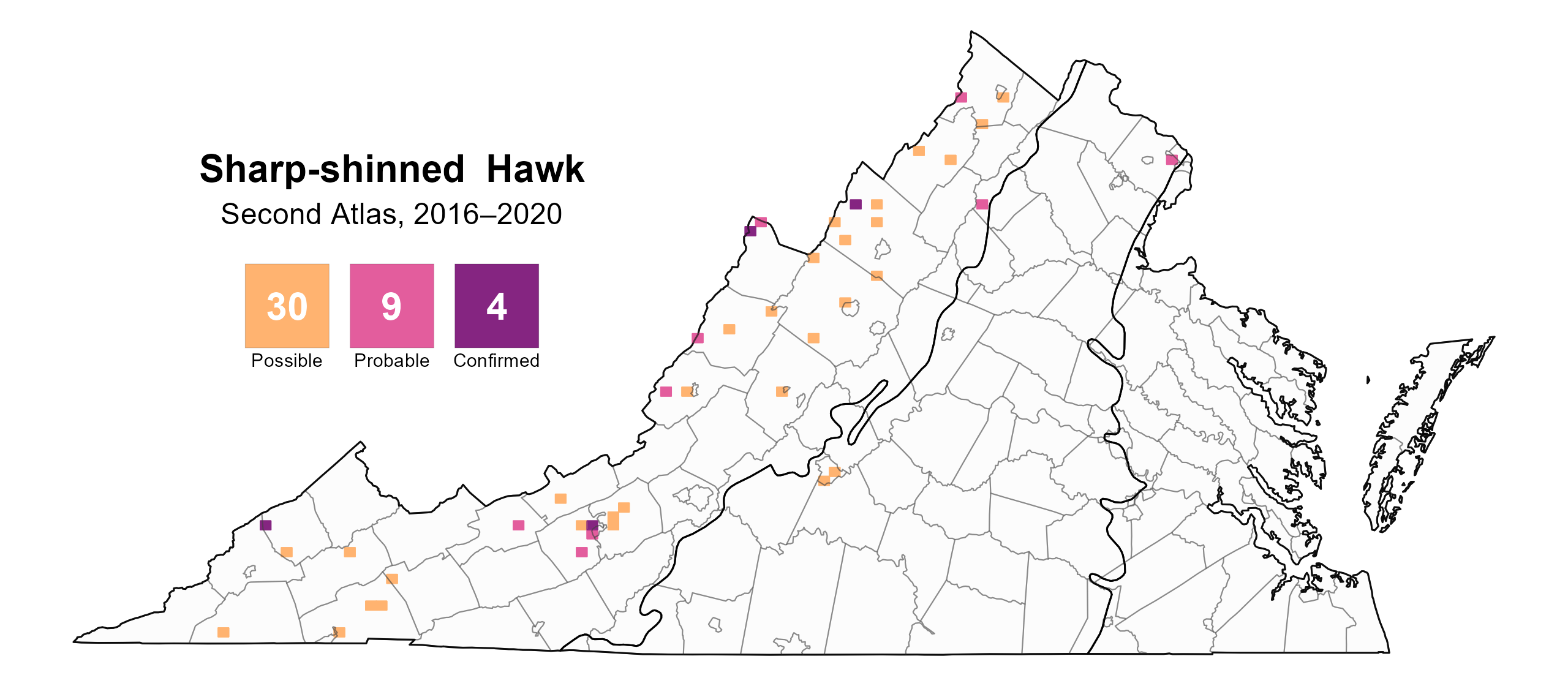 Sharp-shinned Hawks were confirmed breeders in four blocks in Dickenson, Highland, and Rockingham Counties and the city of Radford and were found to be probable breeders in an additional seven counties (Alleghany, Bath, Bland, Fairfax, Frederick, Highland, and Pulaski). Except for a probable breeder in Fairfax County and two possible breeders in Lynchburg, all breeding evidence was observed in the Mountains and Valleys region, which is the most heavily forested portion of the state. The large number of possible breeders is testament to the difficulty in observing and confirming nesting Sharp-shinned Hawks in their dense forest habitat. During the First Atlas, there were only four confirmed breeders and no probable or possible breeders recorded (Figure 2).
