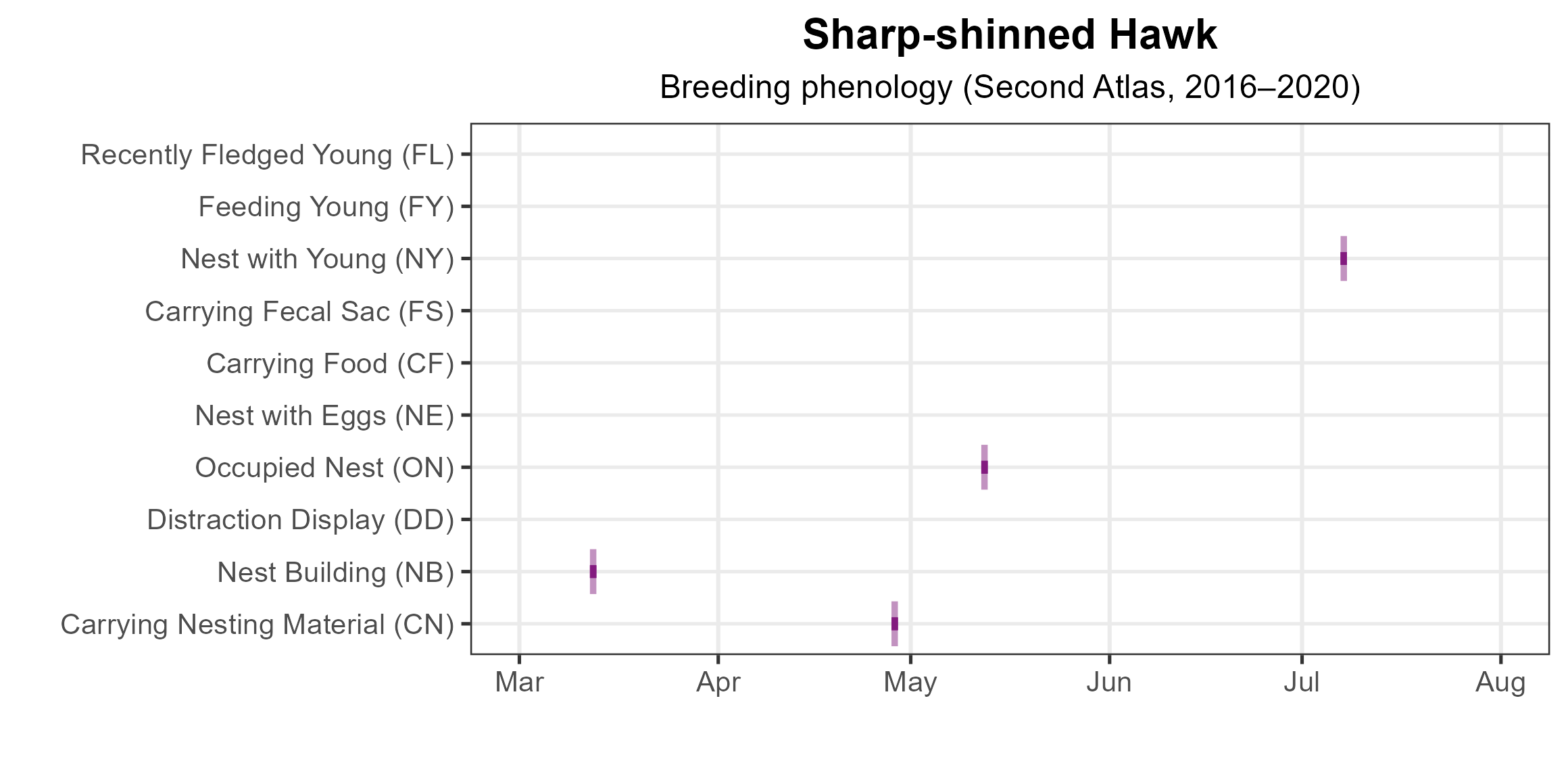 Figure 3: Sharp-shinned Hawk phenology: confirmed breeding codes. This graph shows a timeline of confirmed breeding behaviors. Tick marks represent individual observations of the behavior.