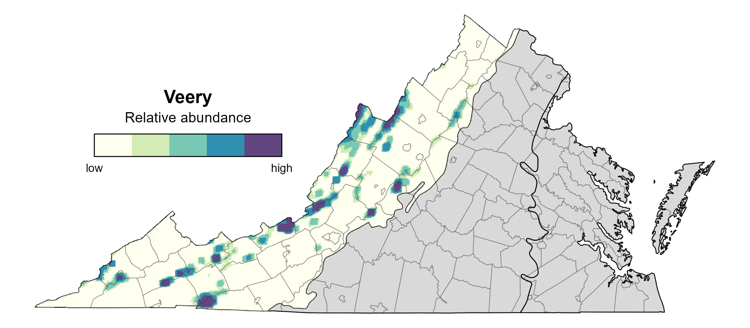 Veery relative abundance was estimated to be highest on slopes and ridges in the Mountains and Valleys region, specifically along the Blue Ridge and Allegheny Mountains (Figure 7). Abundance was particularly high in the vicinity of Mount Rogers (Grayson and Smyth Counties) and Mountain Lake (Giles County) and along the ridgeline at the West Virginia border in Highland and Rockingham Counties.