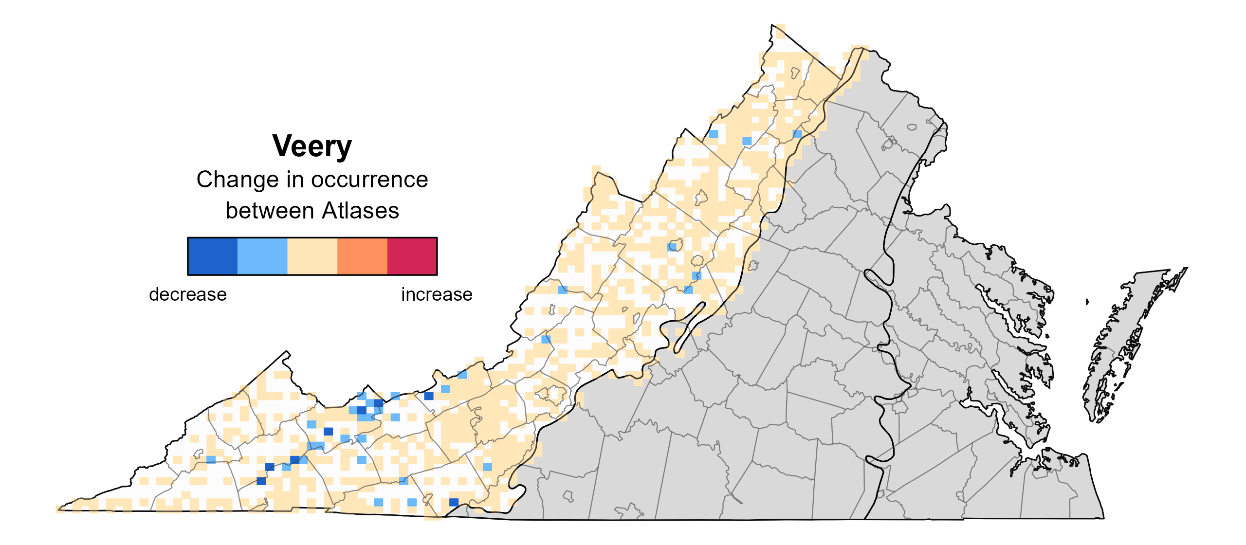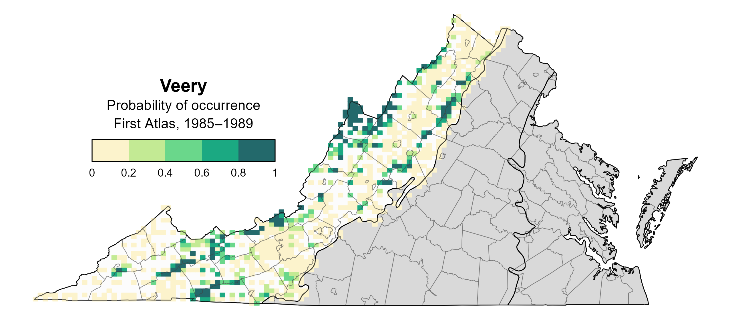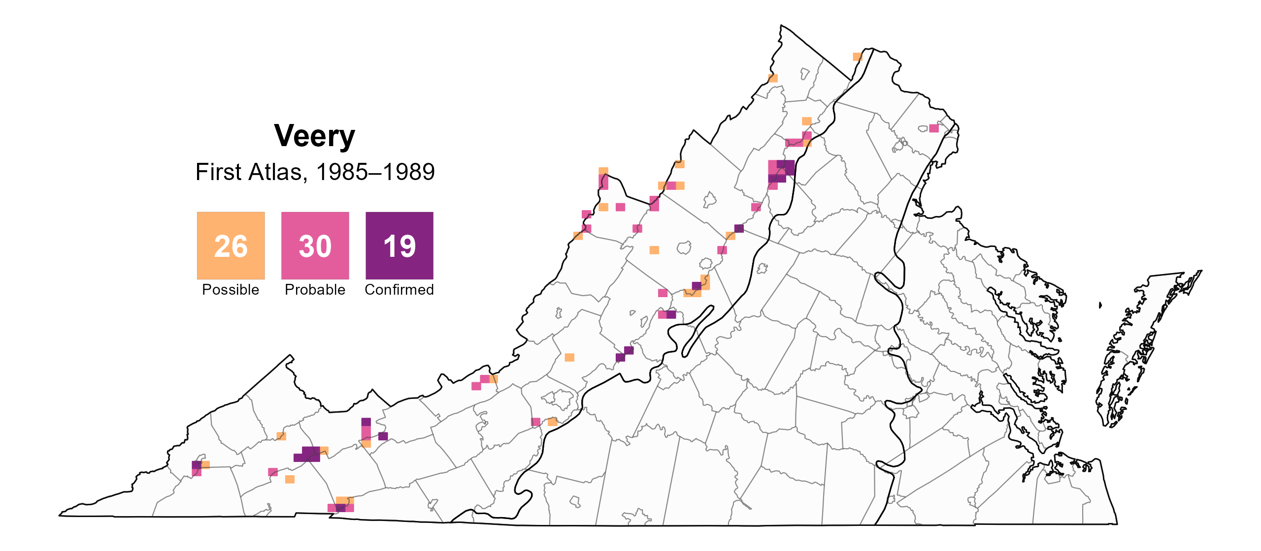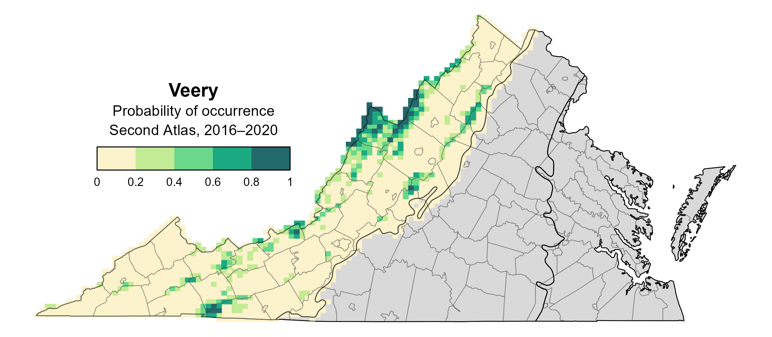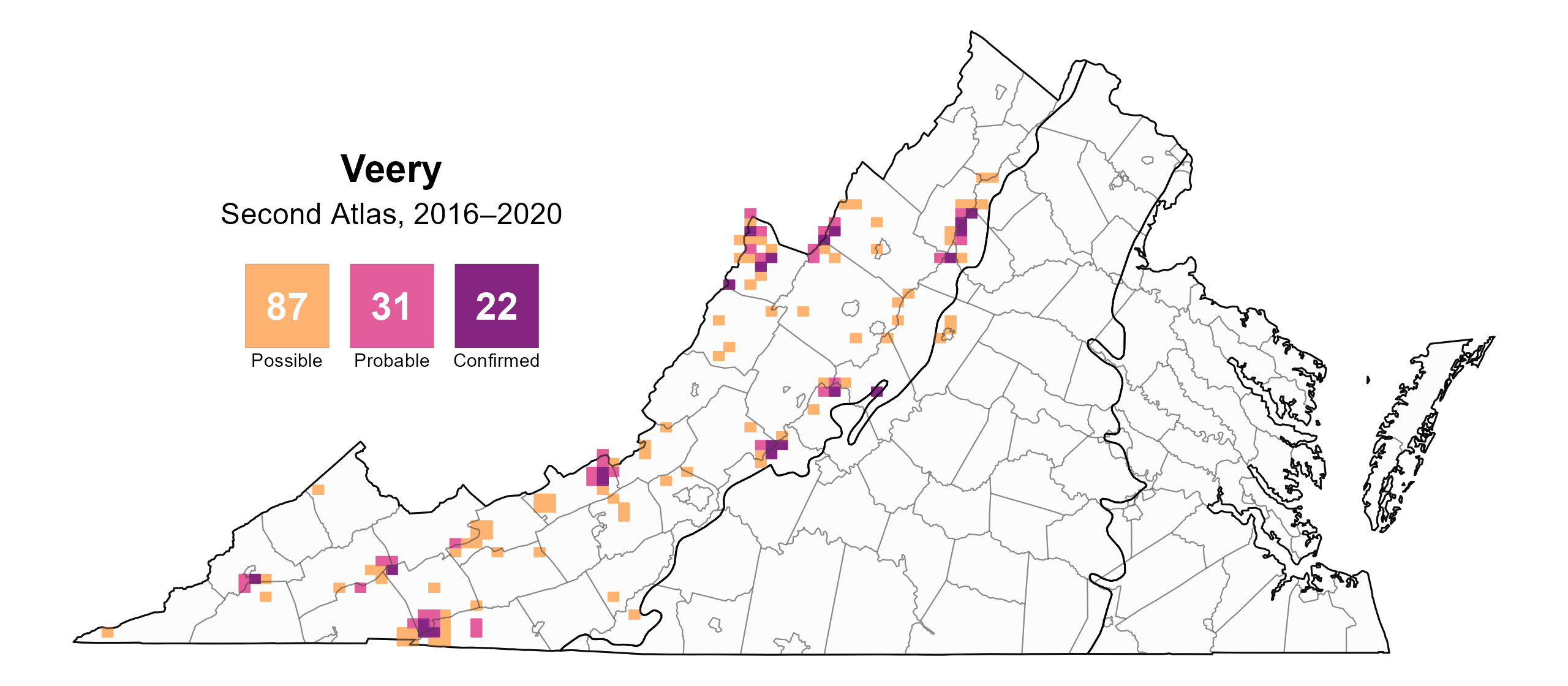Based on ongoing declines in the state, the Veery is included in the 2025 Virginia Wildlife Action Plan as a Tier III Species of Greatest Conservation Need (High Conservation Need) (VDWR 2025). Its distribution within the Mountains and Valleys region is somewhat restricted, but the species is not uncommon in suitable habitats. A 2005–2007 survey of high-elevation bird communities found Veery at 33 out of 37 sites and at 55% of over 1,000 points surveyed (Lessig 2008), with its distribution mirroring that predicted based on Second Atlas data (Figure 1).