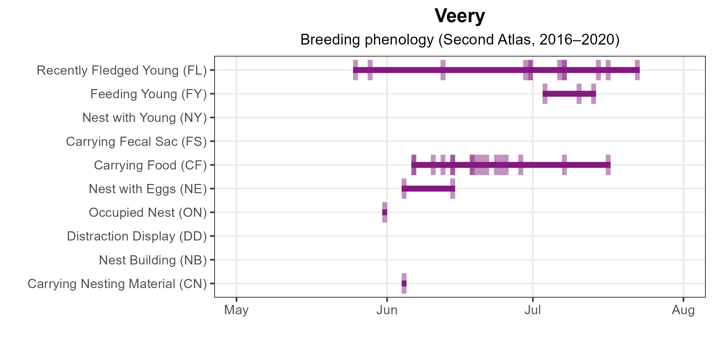 Most breeding confirmations were of adults carrying food or observations of recently fledged young (May 25 to July 22), as Veery nests are typically located on or near the ground in dense understory shrubs and are therefore hard to locate (Hecksher et al. 2020; Figure 6). For more general information on the breeding habits of this species, please refer to All About Birds.