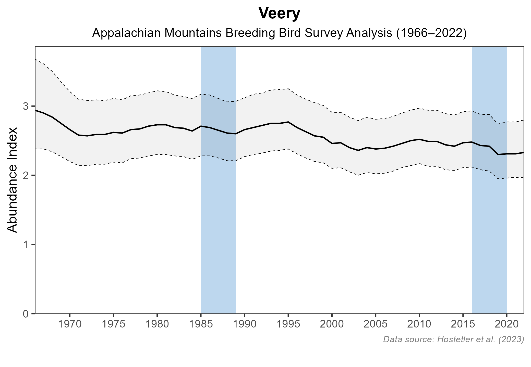 The total estimated Veery population in the state is approximately 77,000 individuals (with a range between 31,000 and 212,000). The North American Breeding Bird Survey (BBS) coverage in the Veery’s breeding range in Virginia is limited; however, the BBS trend for the Appalachian Mountains region showed a significant decrease of 0.41% per year from 1966–2022 (Hostetler et al. 2023; Figure 8). Between Atlas periods, the Veery population decreased by a nonsignificant annual 0.28% from 1987–2018.
